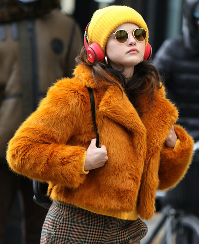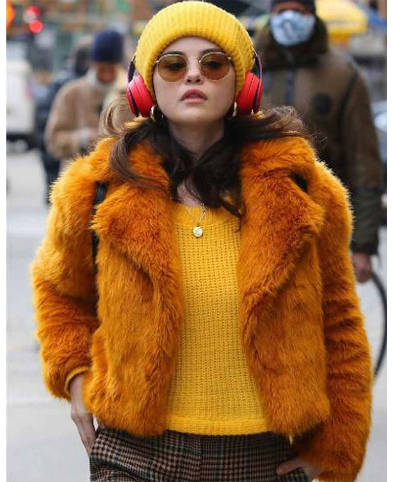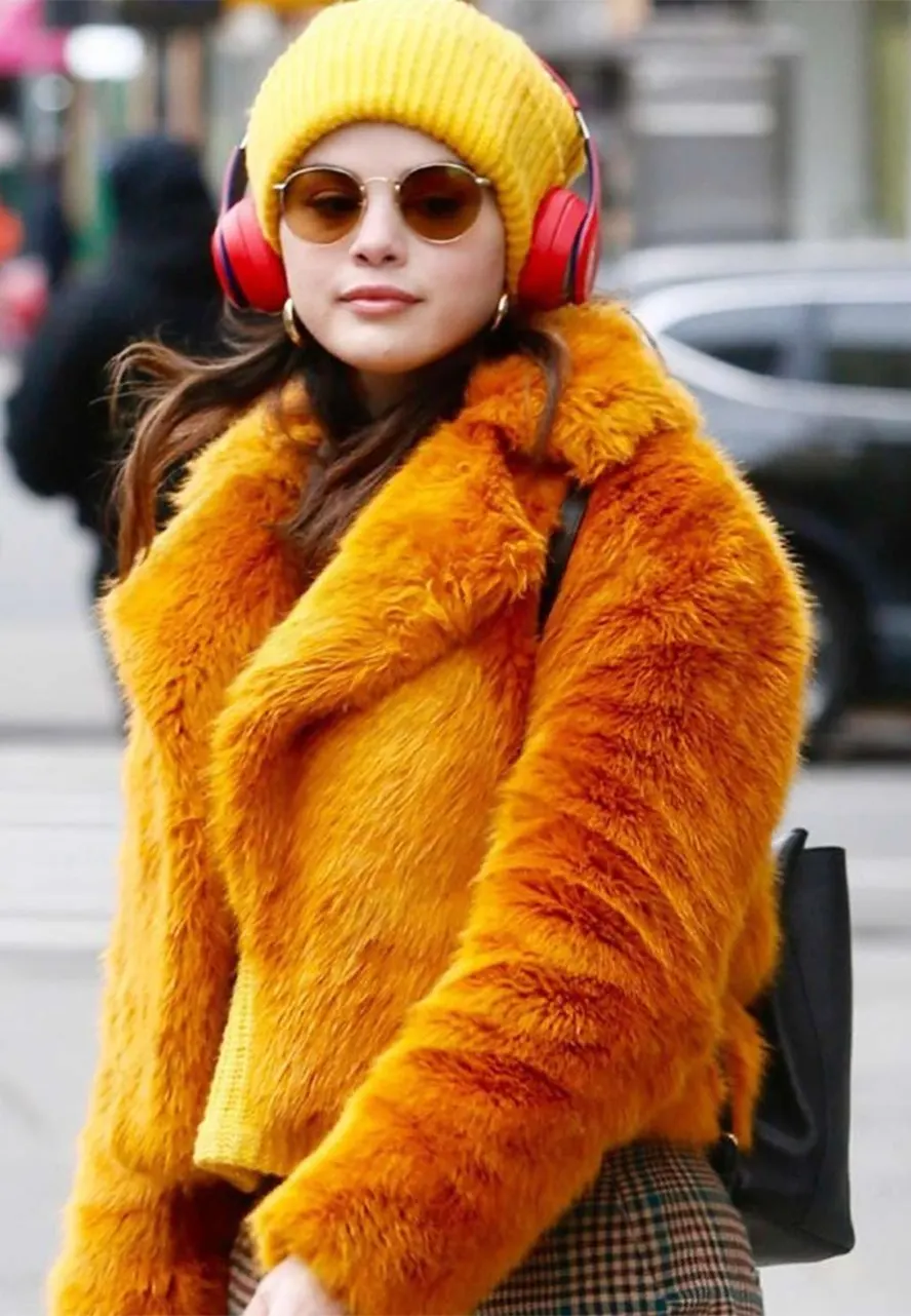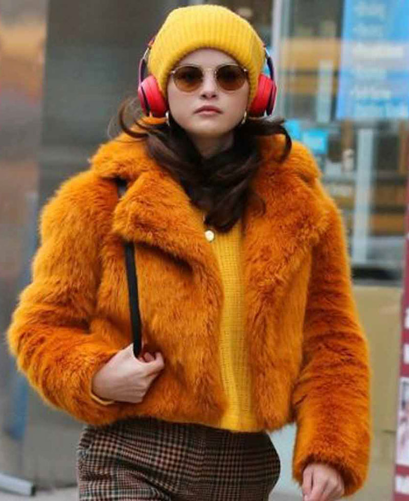 The Gorgeous and Talented Songwriter, Singer, and Actress Selena Gomez Looked Extremely Stunning in This Classy Fur Jacket She Wore for Her Upcoming Comedy Web Television Drama Series Called Only Murders in the Building Where She Portrayed the Character of Mabel Mora. The Mabel Mora Jacket is Fabricated With Top-quality Faux Fur Material. On the Internal Side of This Jacket, There is a Smooth and Soft Viscose Lining Attached That Provides You Warmth and Comfort. The Mabel Mora Jacket Comes in an Appealing Orange Color. The Front Open Look of This Fur Jacket Looks Attractive. Selena Gomez Only Murders in the Building Jacket Has a Lapel-style Collar. The Jacket Has Open Hem Style Cuffs on Full-length Style Sleeves. Selena Gomez Only Murders in the Building Jacket Come With Two Front Waist Pockets Where You Can Secure Stuff.