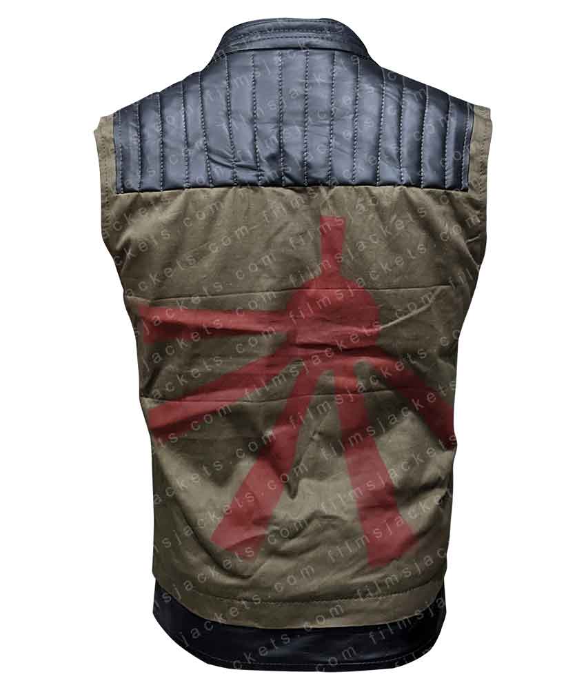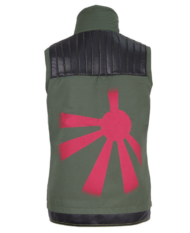 Outer part of Fun Ghoul Vest is made from cotton fabric and faux leather to create uniqueness. The high stand collar has made it fabulous. You have never been worn vest like this. Two flap pockets with button are on the chest. Green and black mishmash is looking winsome. Danger Days Vest has black leather piece on front shoulders and upper back with quilted linings. Front zipper closure is for easy wearing. Black leather hemline is also looking artistic. Logo of “My Chemical Romance” band is present on left chest.