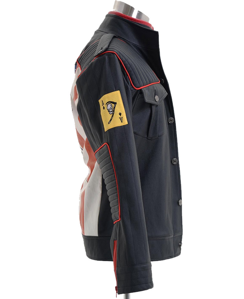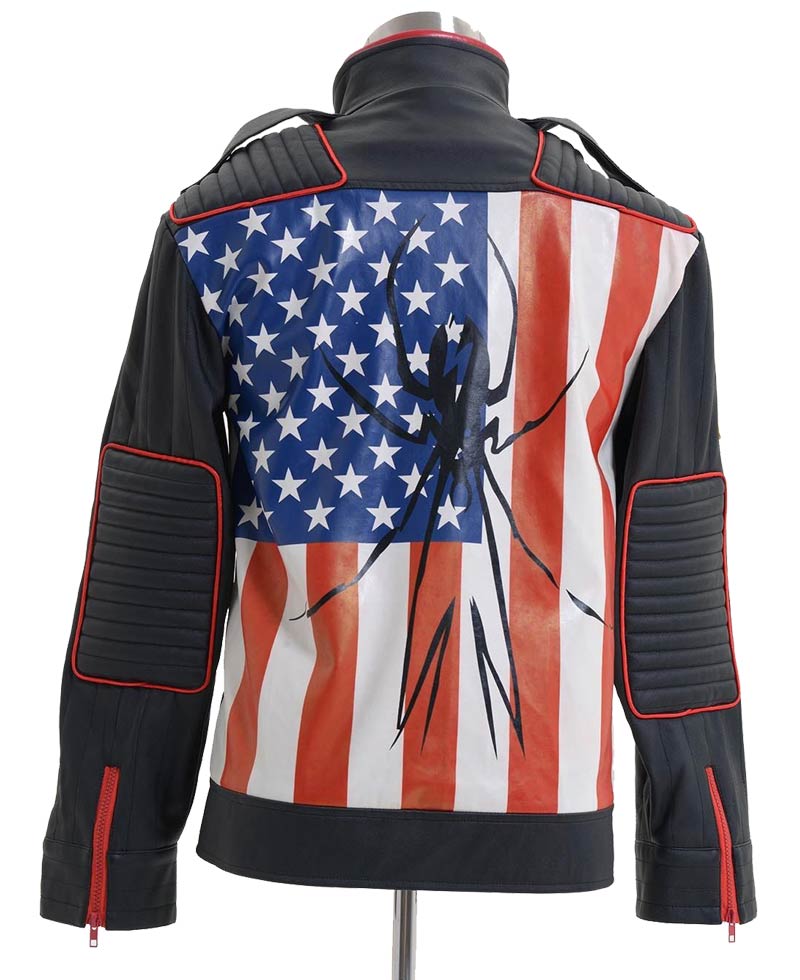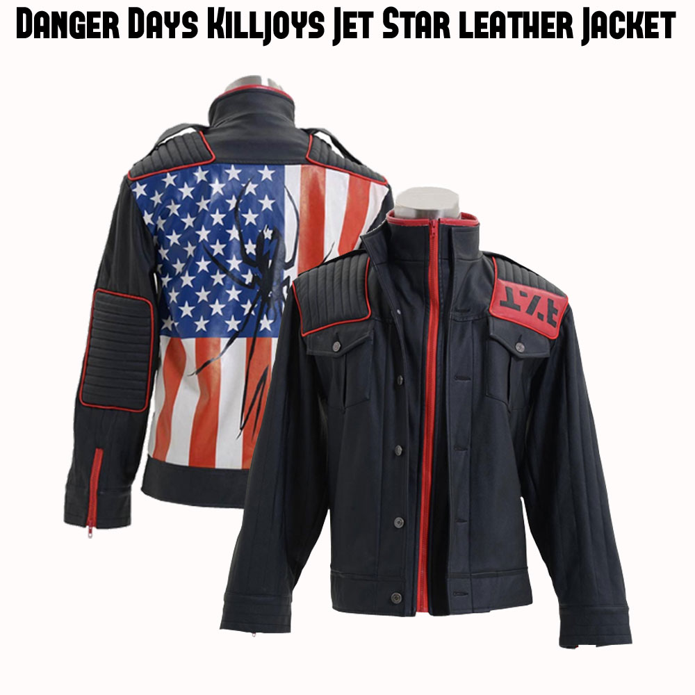 Best genuine leather has formed the outer shell of the Jest Star Jacket. Black shade with red combination is looking ambitious. High stand collar is given in the dress. The front has two ways of closing which are zipper and buttoned. Two flap pockets with button are present on the chest. Quilted lining leather patches are added on both shoulders and elbows. Danger Days Jacket has American flag on the back. Sleeves are long and have normal fitting. Straps are given on both shoulders. Yellow card like leather piece is on right arm. Zipper cuffs are the end of sleeves. Viscose lining is also given. Red zips are used in the dress to create unforgettable beauty.