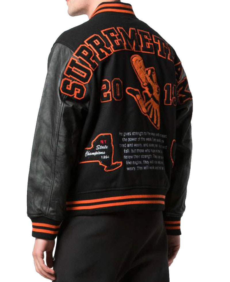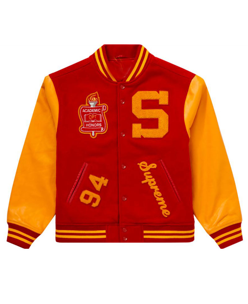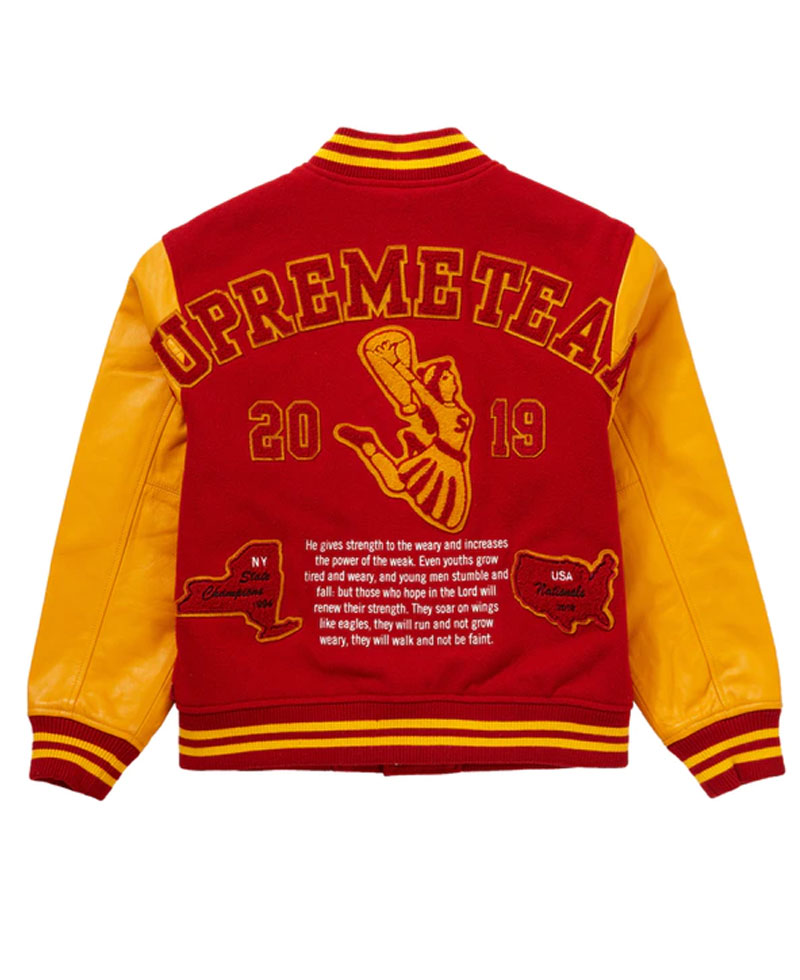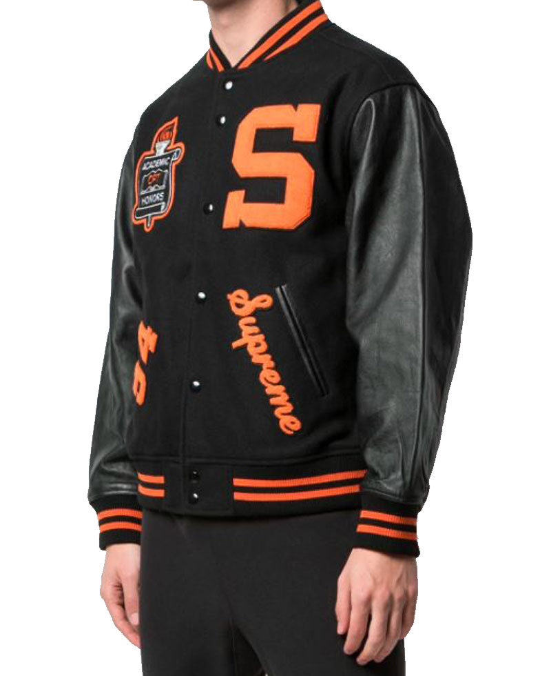 The Stylish Supreme Team Varsity Jacket Comes in an Appealing Black and Red Color. The External Side of This Letterman Jacket is Fabricated by Using High-quality Wool Material. Premium Quality Genuine Leather Material is Used as Well for the Sleeves. The Supreme Team Varsity Jacket Comes With Its Internal Area Covered With Smooth and Soft Viscose Lining That Keeps You Warm and Comfortable All the Time. The Jacket Has Buttons Attached to Its Front Side for Closure. The Supreme Team Varsity Jacket Has Two Front Waist Pockets Where You Can Secure Stuff. It Has a Rib Knitted Erect Style Collar That Looks Stylish. The Supreme Team Letterman Jacket Has Rib Knitted Style Cuffs on Full Length Style Sleeves. There Are Supreme Team Patches on the Front and on the Back of This Jacket. The Jacket Also Has a Rib Knitted Hemline.