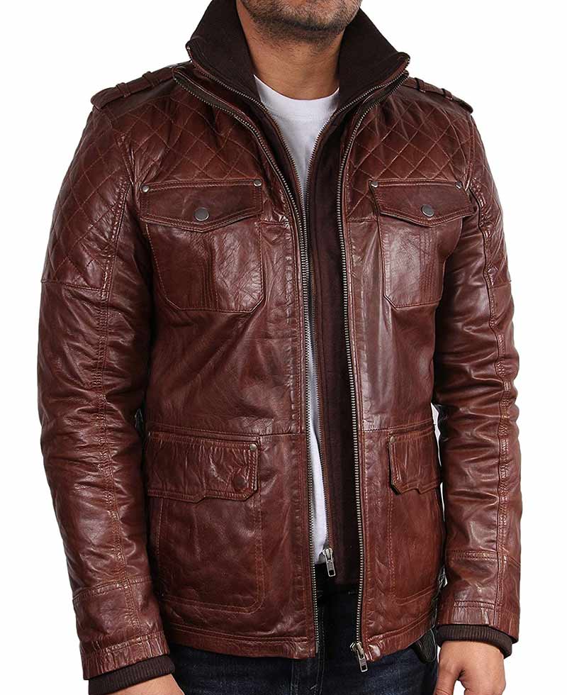 Go out with stunning look and leave unforgettable impression on the mind of others. Dress up yourself with our new double collar jacket. Composed from high quality genuine leather with viscose lining, available in attractive brown color. Having unique double collar style with zip closing front adds classic touch. Quilted detailing on front shoulders and upper part of the sleeves makes it admirable. Four big flap pockets are given on front and waist makes 4 pockets jacket dynamic. Including snap button epaulet on shoulders gives dazzle look. The attire has long sleeves with open hem cuffs. Perfect stitching completes the appearance of the men’s brown leather jacket.
