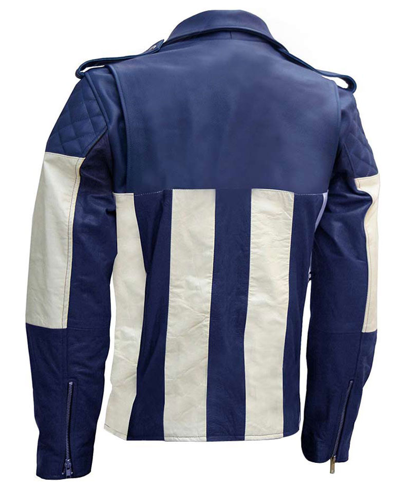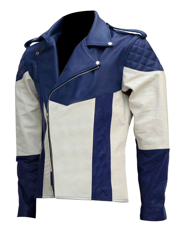 Making a striking impression in one swift motion of motorcycle has now been put to ease by and intricately designed blue and white motorcycle jacket. Blue and white leather jacket is available in both genuine leather and faux leather ensuring the top notch quality for its consumers. The asymmetrical zipper closure along with lapel collar with studs detailing helps to entangle the breezy, carefree yet a sophisticated vibe of the blue and white motorcycle jacket. The leather motorcycle jacket has blue and white colour transitions throughout the jacket with the interesting part being the alternating colored stripes at the lower back of behind and quilted detailing on the blue upper arm of full zipper cuffed full length sleeves. To completely tie the look of blue and white leather jacket snap tab straps are present on shoulders and two internal pockets are present on viscose lined jacket.