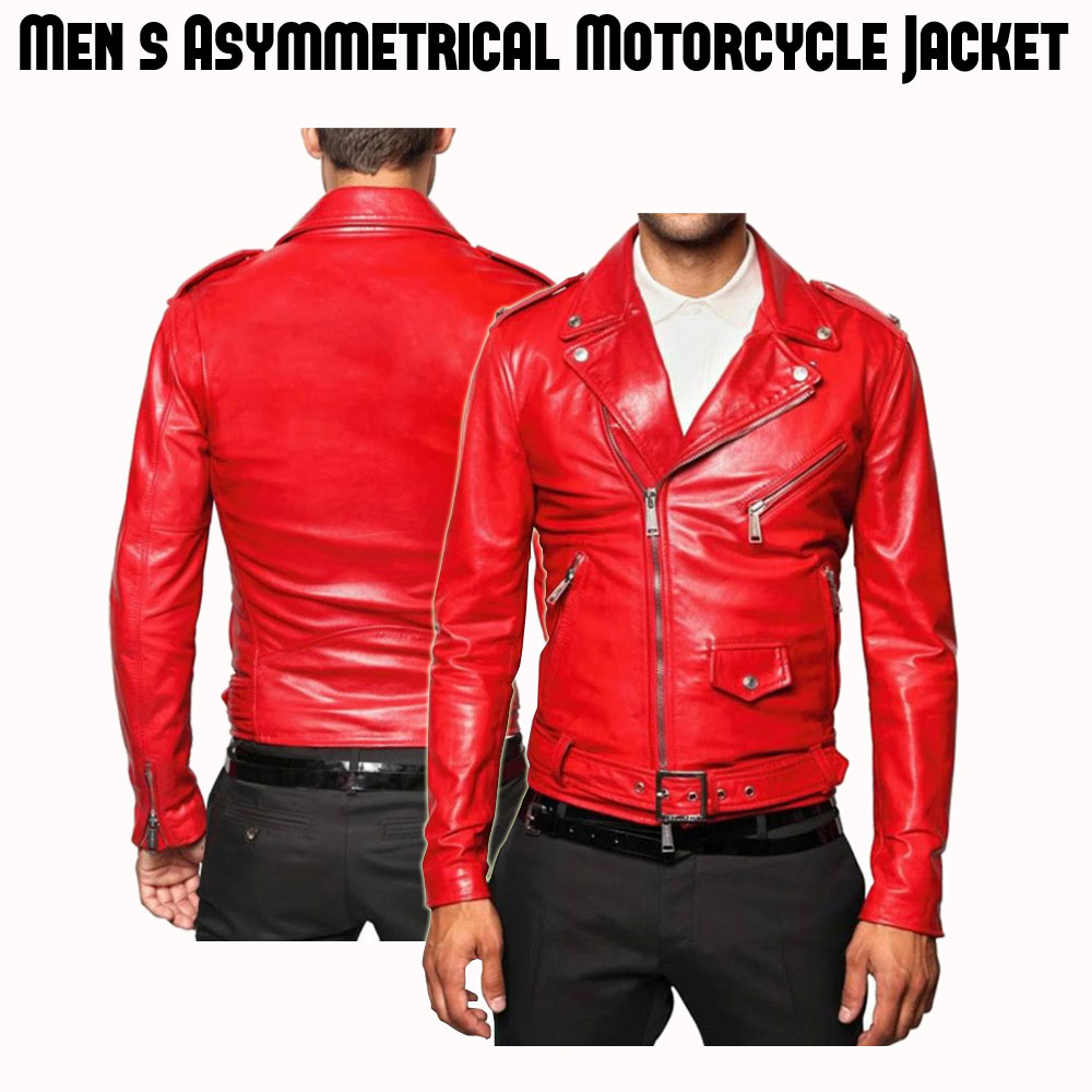 Men's Belted Asymmetrical Zipper Red Leather Motorcycle Jacket