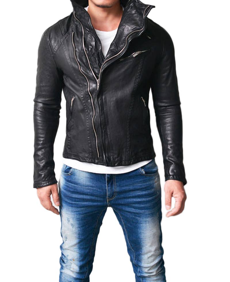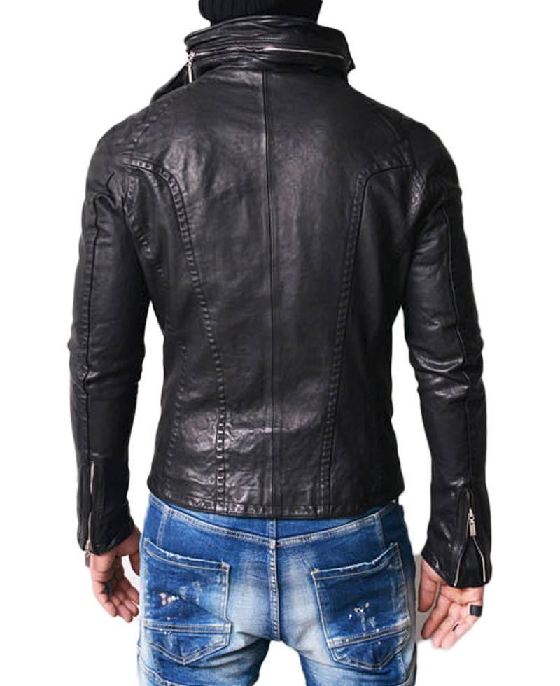 Amaze other from your new and smart look. High neck leather jacket especially design for younger’s. It has been composed from high quality genuine leather. The color of the attire is black. The jacket wired high neck collar with asymmetrical double zip closure front makes the attire stylish and fabulous. There are two zipper pockets on waist and a single pocket on chest. The sleeves are full and fitted along zipper cuffs creates foxy look and enthralls appealing touch. Asymmetrical leather jacket has zippered details on collar makes lavish outfit. Viscose material is used for inner lambskin leather jacket is a perfect piece for clothing.