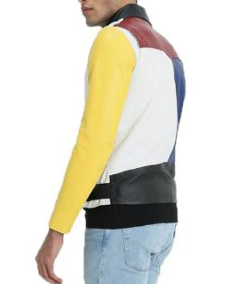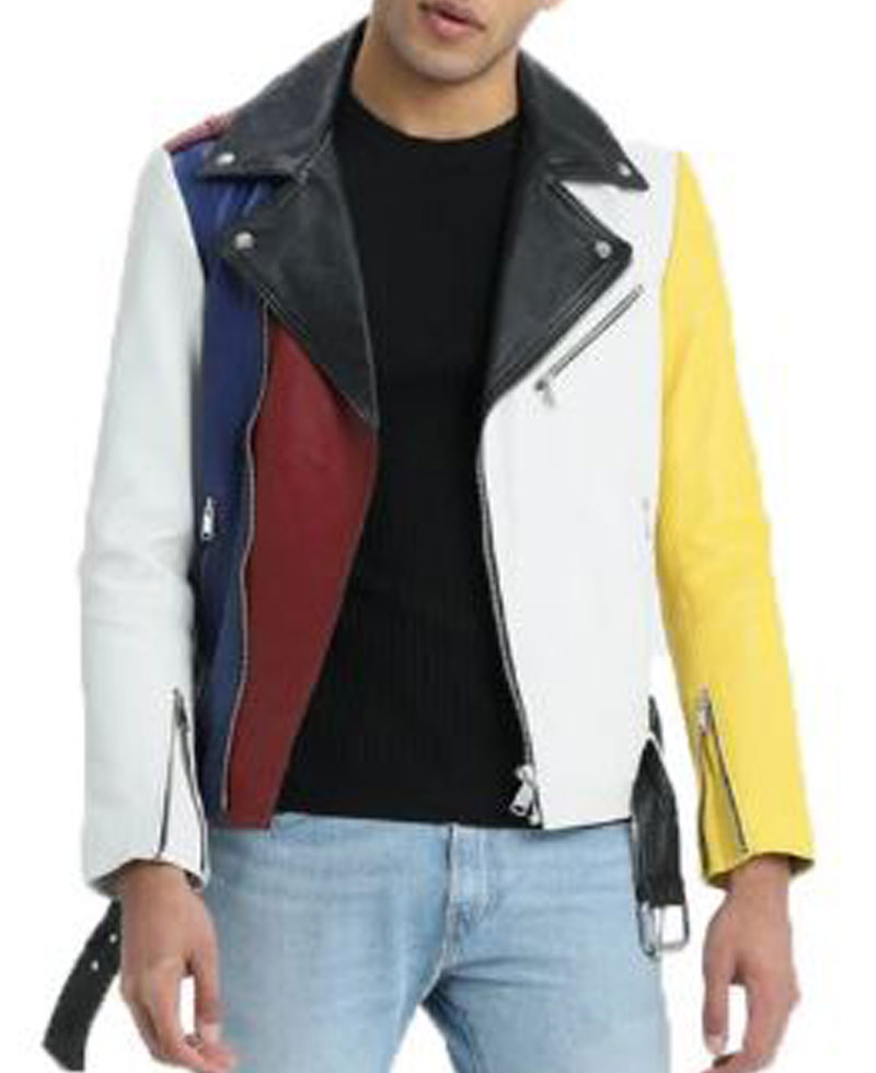 Mens multi color leather jacket is manufactured with premium quality of genuine leather material. The jacket has various combinations of colors ie; red, blue, yellow, white, and red to be precise. The color makes the appearance of this jacket more appealing. On the internal side of this Mens multi color leather jacket is a lining of smooth and soft viscose that guards you against cold weather and keeps you warm and comfortable. The notch lapel style collar on the front of this jacket looks good. There is a ykk branded asymmetrical style zipper attached to the leather jacket for the closure. The men’s asymmetrical biker leather jacket has front zipper chest and waist pockets where you can secure stuff. This jacket has shoulder epaulets along with a belted hemline that makes it more attractive and trendy to wear. The zipper cuffs on full length style fitted sleeves completes the perfect look of this leather jacket.