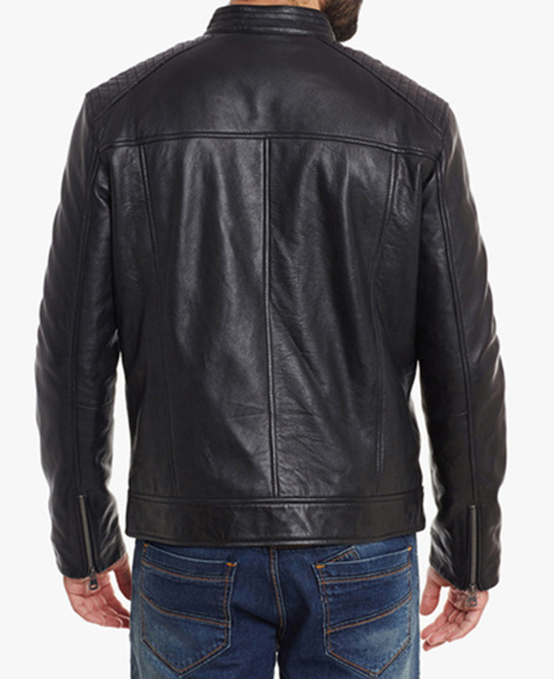 Men’s Snap Tab Collar Padded Biker Black Leather Jacket