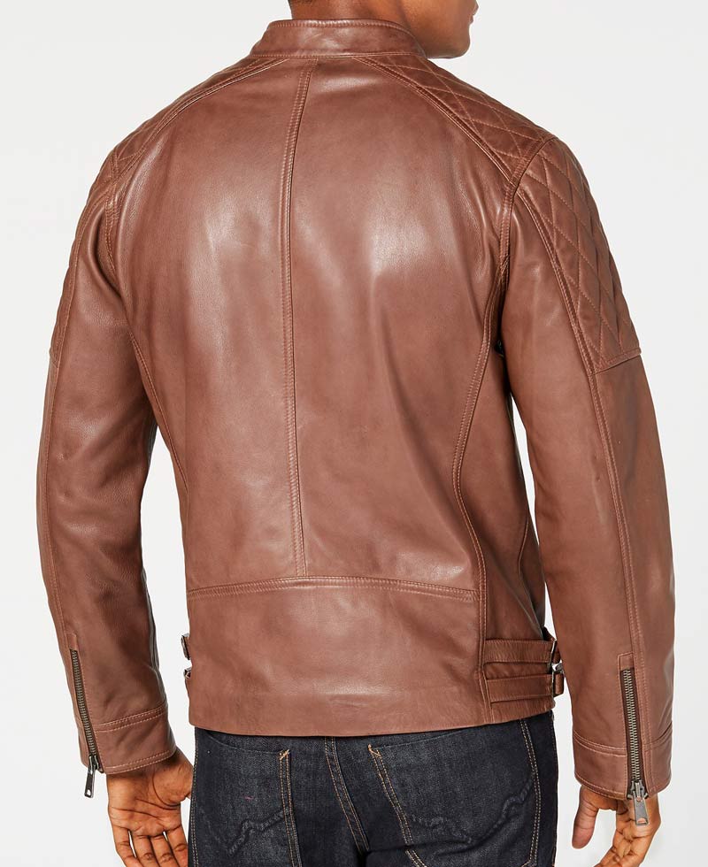 Men’s Asymmetrical Zipper Diamond Quilted Design Motorcycle Brown Leather Jacket