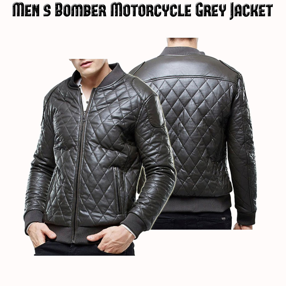 Men’s Bomber Motorcycle Grey Diamond Quilted Leather Jacket
