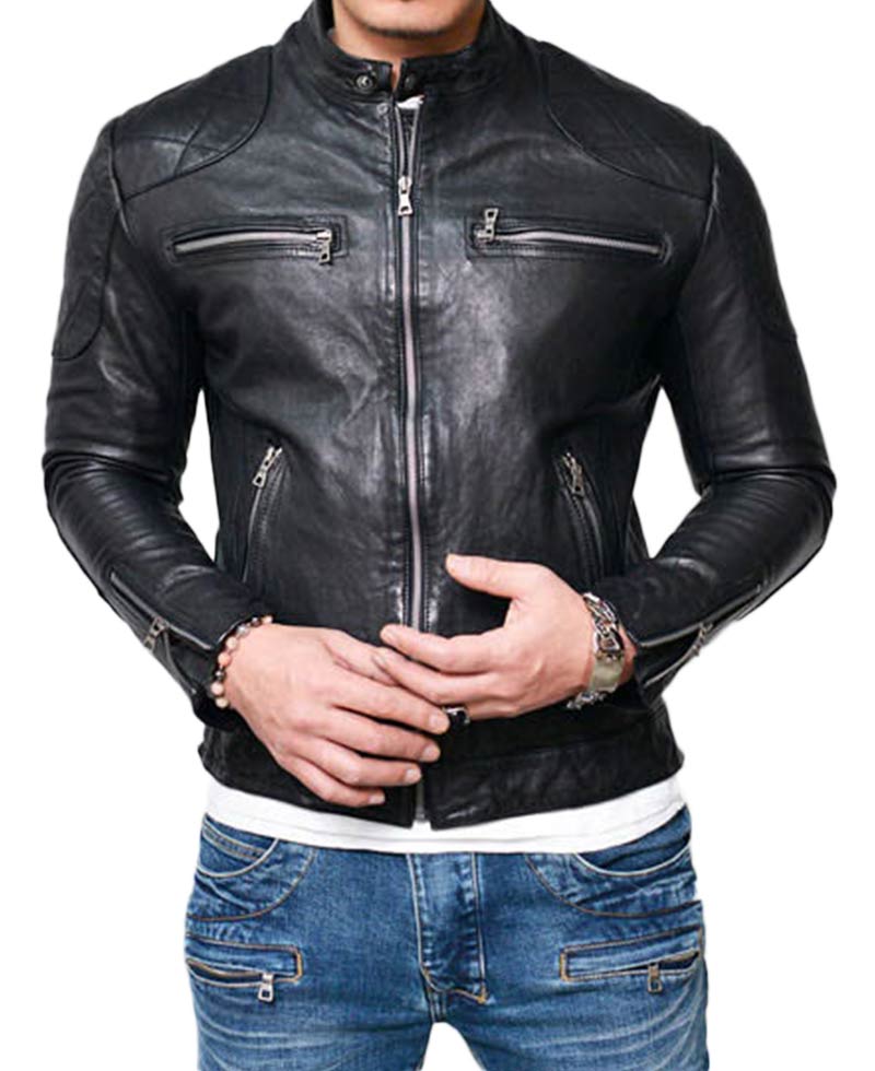if you want that one leather jacket should suit on your all clothes than take my suggestion and go for this zipper leather jacket. Prepared from best quality genuine leather. The interior of the jacket made from viscose material. The front consist of snap tab collar with zip closing embellish along quilted designing at shoulders and sleeves on lambskin leather jacket makes it outstanding. There are four zipper pockets two vertically place on waist and two horizontally place on chest for your belongings. Biker black leather jacket has stunning look. The sleeves are full along classy zippered cuffs, available in black color.