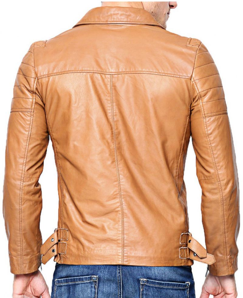 Now enjoy the most celebrity fashionable style of slim fitting Brown Leather Biker Jacket that is elegant and captivating. It will make you a super appealing personality among the presence of many people. The outer shell of Brown Leather Biker Jacket is prepared from genuine leather or faux leather. The quilted shoulders are the unique feature which is not present in other outerwear. Make your façade impressive and magnetic by wearing Mens Slim Fit Jacket. To make you more eye-catching the adjustable buckles are given at waistline, you can adjust it according to your size. The shade of the dress is light brown that is engaging. Mostly men like shirt collar and you will enjoy shirt collar in Mens Slim Fit Jacket. The viscose inner lining has made it more comfortable and luxurious. The front is decorated with branded zipper closure that results in simple wearing of Light Brown Leather Biker Jacket. To enhance attraction one zipper pocket is present on chest whereas two side waist zipper pockets are also added.