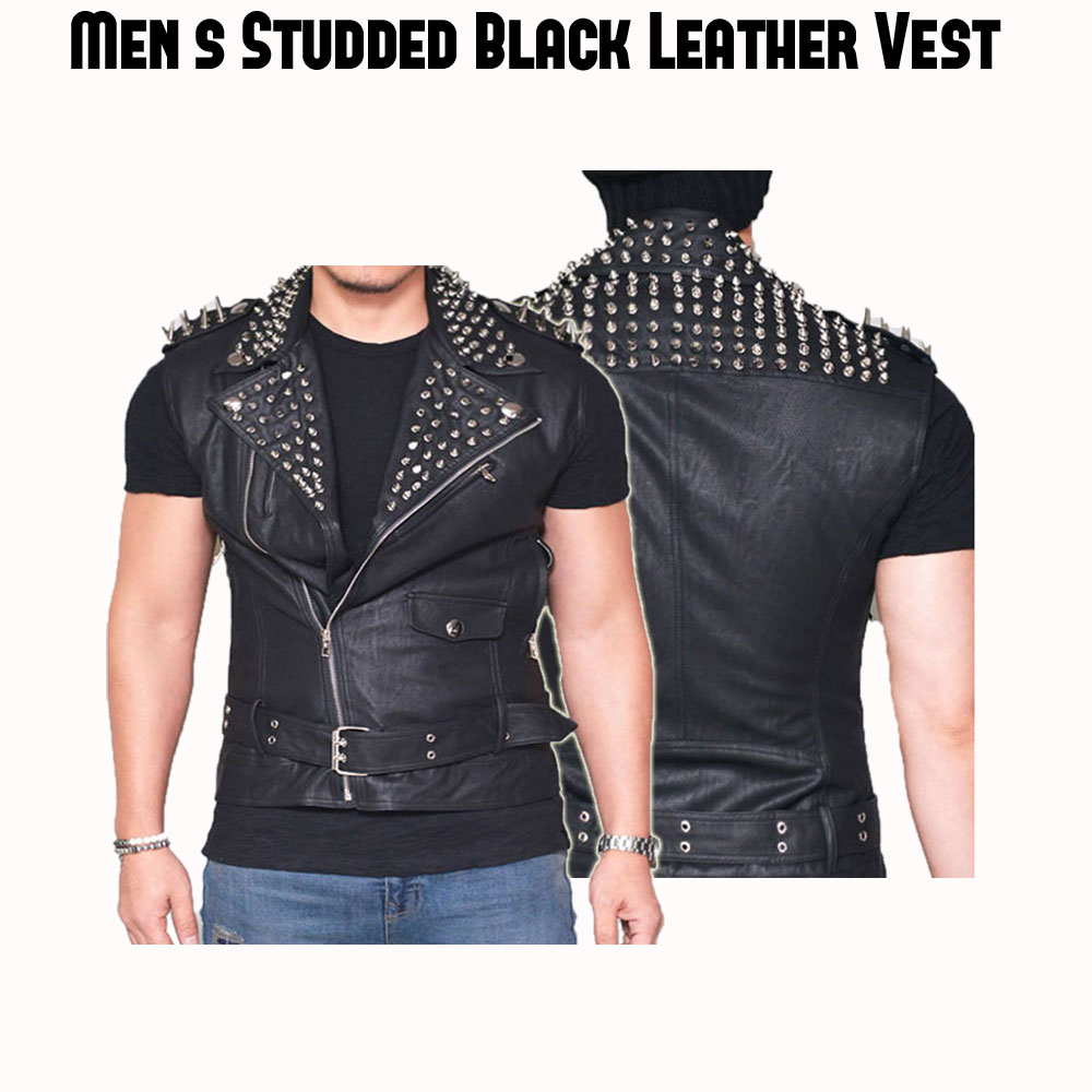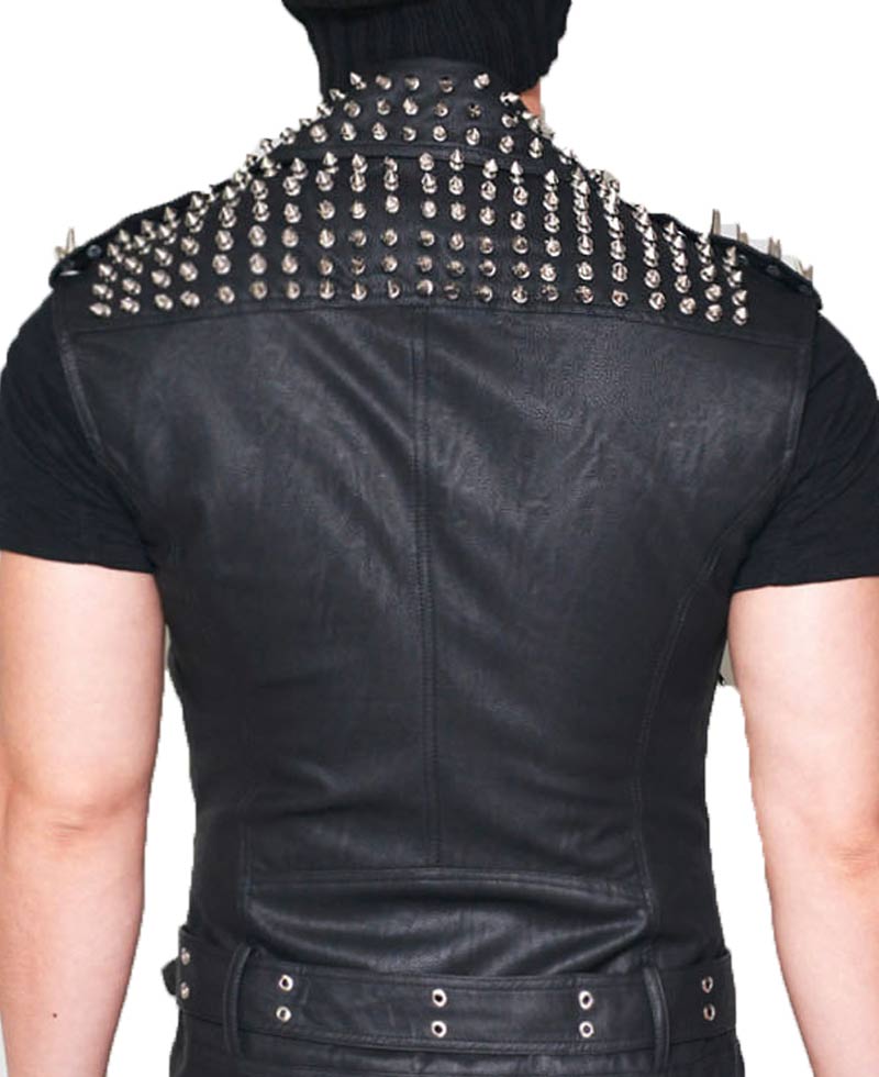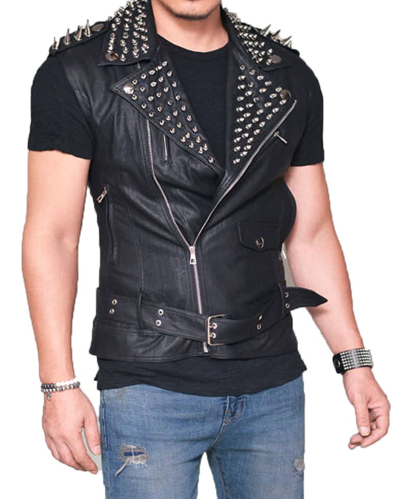 Become a style statement with our studded leather vest. Get spectral look and handsome touch in your appearance. High quality genuine leather is used in preparation f the attire. The front consists of asymmetrical zip closing gives charismatic touch. It has lapel collar, silver spikes studs are used in decoration on collar, shoulders front and also back makes black leather vest versatile. There are four zipper pockets given on chest and waist and each single flap pocket is given on left side. Adjustable waist belt increase the charm of belted leather vest.