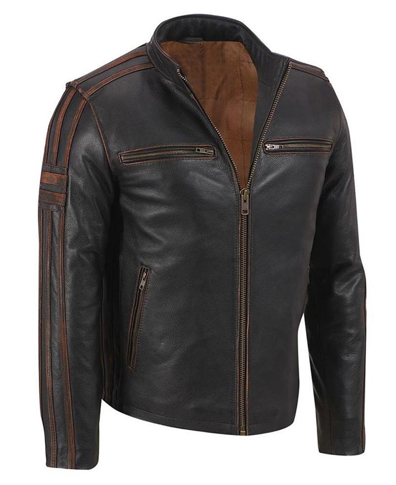 Men’s cafe racer jacket is a splendid choice to be made when you are willing to wrap yourself in one of the most stylish and posh outfits manufactured from genuine leather. Brown leather stripe jacket is a master piece of stitched article which is inner lined by viscose material. The promising men’s café racer jacket is designed by hem cuffs over the end of the sleeves with brown stripes integration running along the shoulders together with the two horizontal strip cut designs which is one of the famous characteristic of this article. The closure YKK zipper provides the ease to you either to keep open the opposite halves of jacket or to close them as a consequence of environmental extremes or due to dust while wearing it on motorcycle.