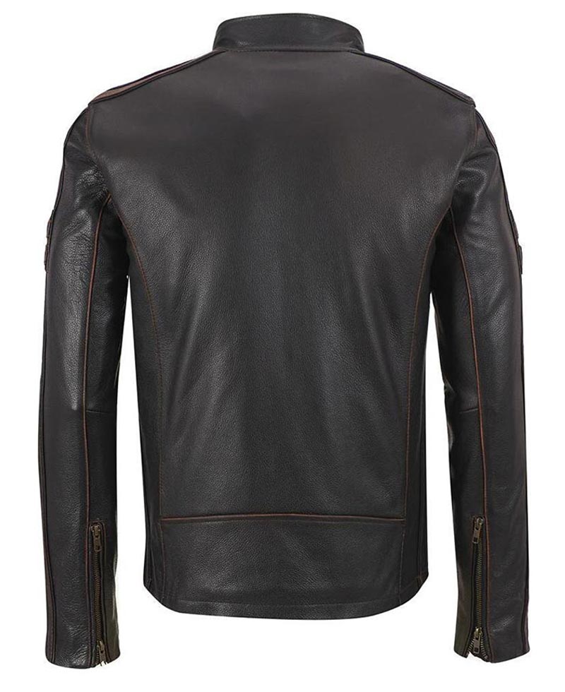 Men’s Four Zipper Pockets Cafe Racer Stripe Brown Leather Jacket