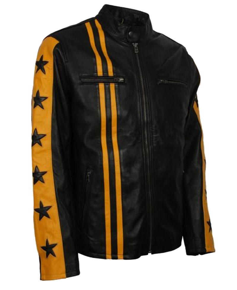 Men’s Star Striped Yellow Biker Cafe Racer Black Leather Jacket