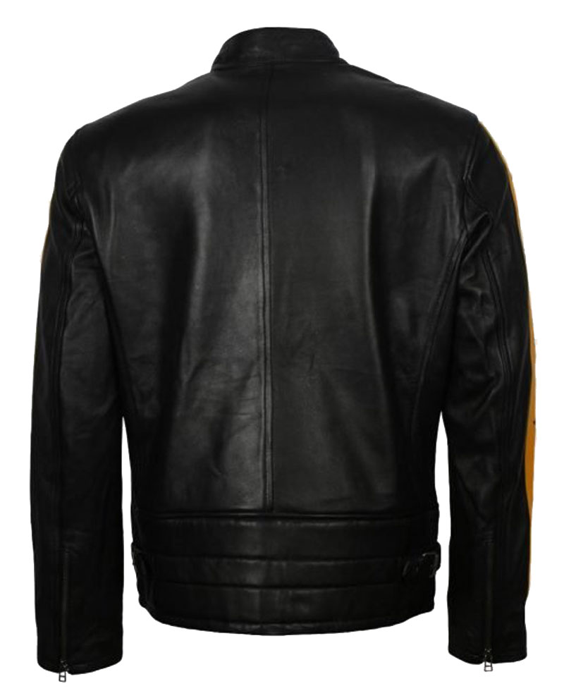 The stylish cafe racer star jacket is made by using rich and premium quality genuine leather material. The internal side of this jacket is stitched with a smooth and soft viscose lining that keeps you warm and comfortable all the time. The fine quality stitching makes this jacket durable to wear. The cafe racer star jacket comes in an attractive black color. There is a ykk branded zipper attached to the front side of this biker jacket for the closure. The jacket has a snap tab style collar. There are yellow stripes on the front side of this jacket and on the sleeves. The jacket has zipper cuffs on full length style sleeves. The yellow striped jacket has two front zipper chest pockets and two zipper waist pockets to secure stuff. This cafe racer star jacket is perfect for parties and outings.