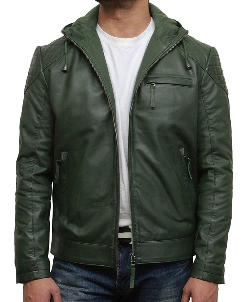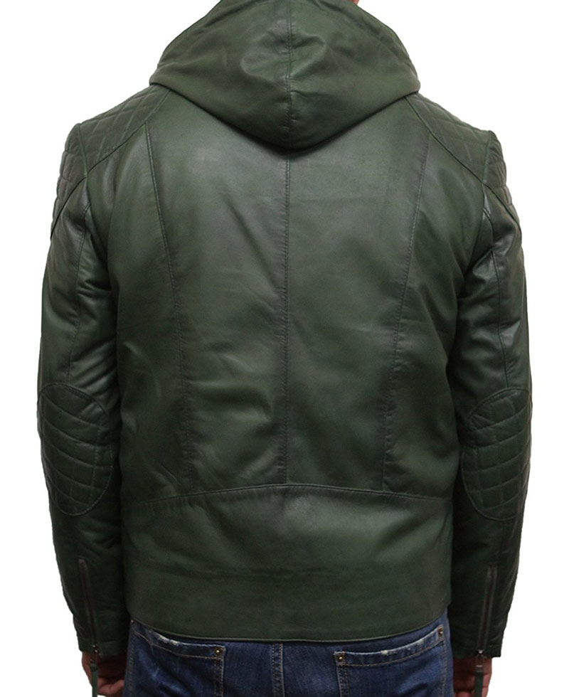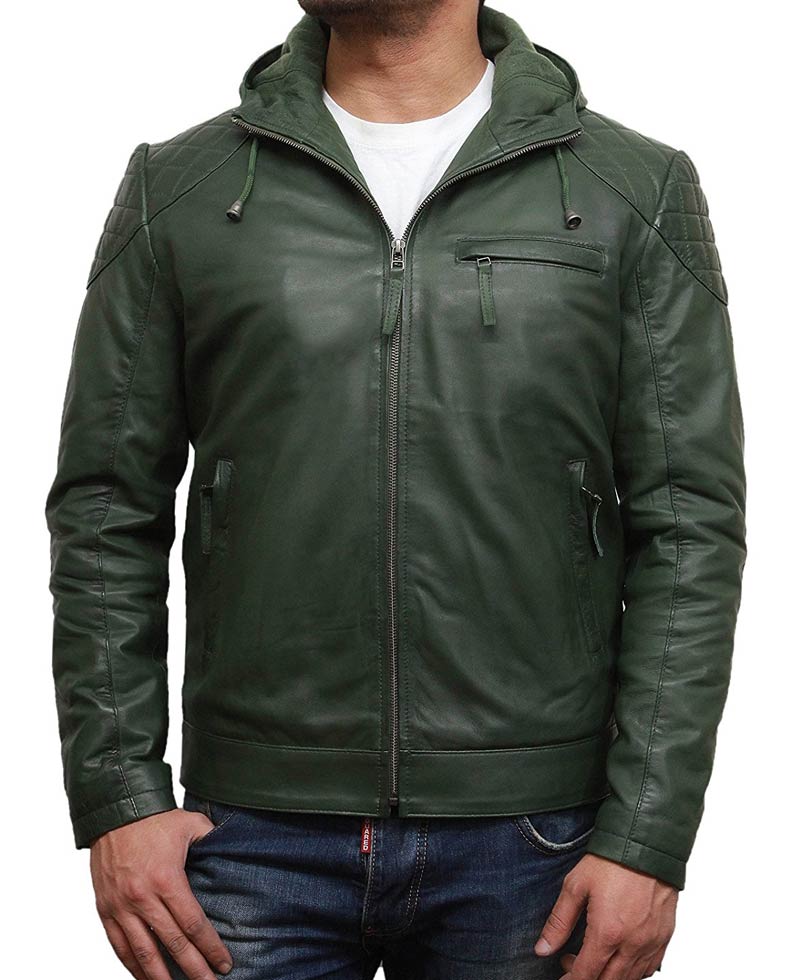 Green leather hoodie is a pioneering fashion proclamation like no others. Elegantly designed master piece made from genuine leather and also has faux leather with viscose lining inside. Quilted padded design elements are given at shoulders and elbows will rock your leek like a real champion. Green leather hoodie has zipper shutting on front with hood attachment. Green color gives mesmeric look. This unique outfit comprises of horizontal pocket on chest and two vertical pockets on waist. The sleeves are full in length with zipper cuffs gives astonish looking.