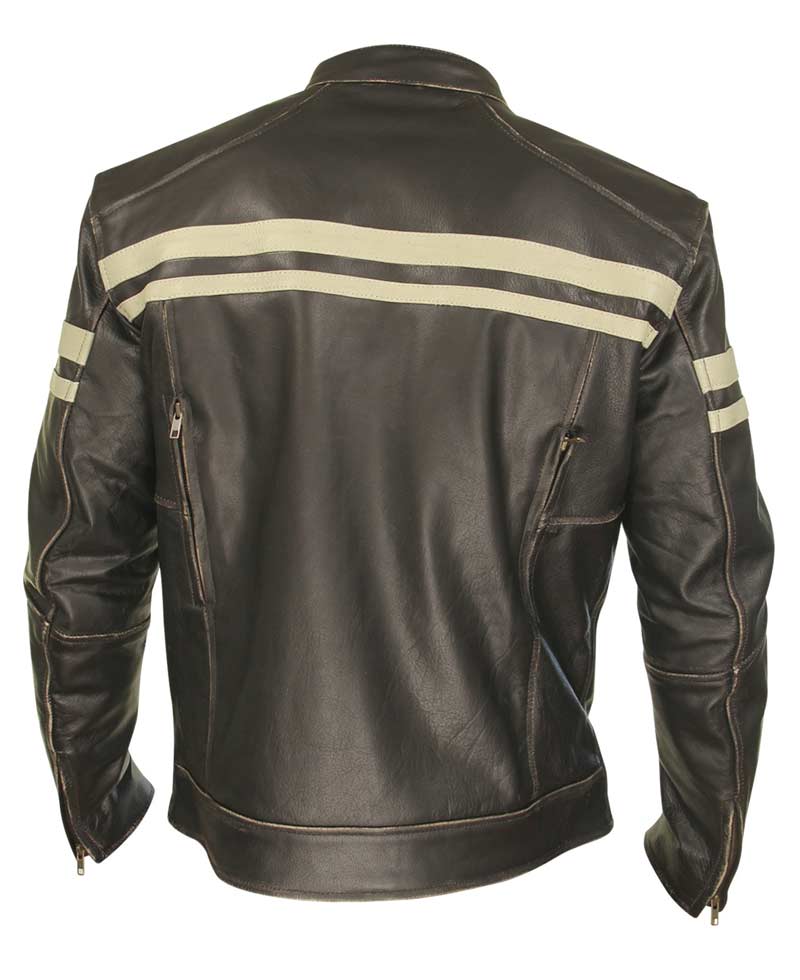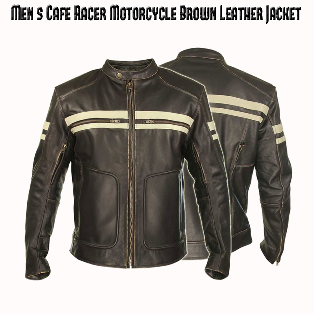 Men’s Cafe Racer Motorcycle Brown Leather Jacket with White Striped