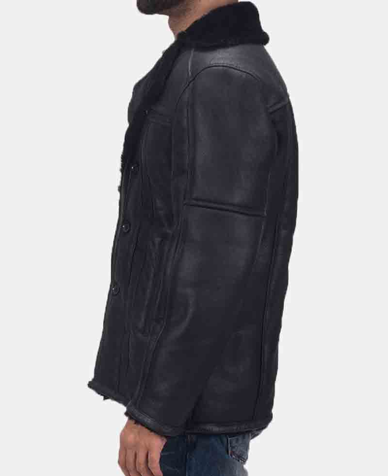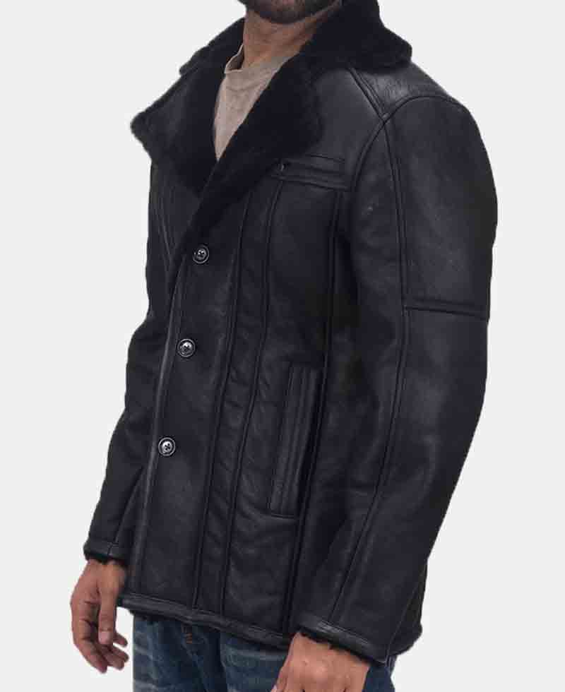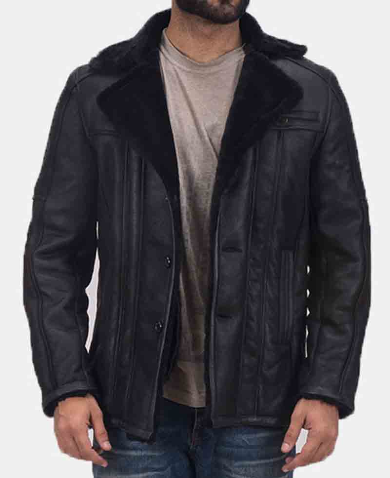 black leather shearling jacket is manufactured from high quality of genuine leather material. The material quality is durable and guaranteed. This jacket is very comfortable as it contains inner shearling lining. This jacket is manufactured to protect you from cold weather and to make you feel warm and cozy. This jacket will give you a trendy and appealing look. double face leather shearling jacket has a notch style collar. This leather jacket has full length sleeves with open hem style cuffs. The front button style of this jacket fits in perfectly with the style of this jacket. There are two inside pockets of this jacket along with three outside pockets. You can get this leather jacket here in a black color. Order this jacket right now without wasting much time.