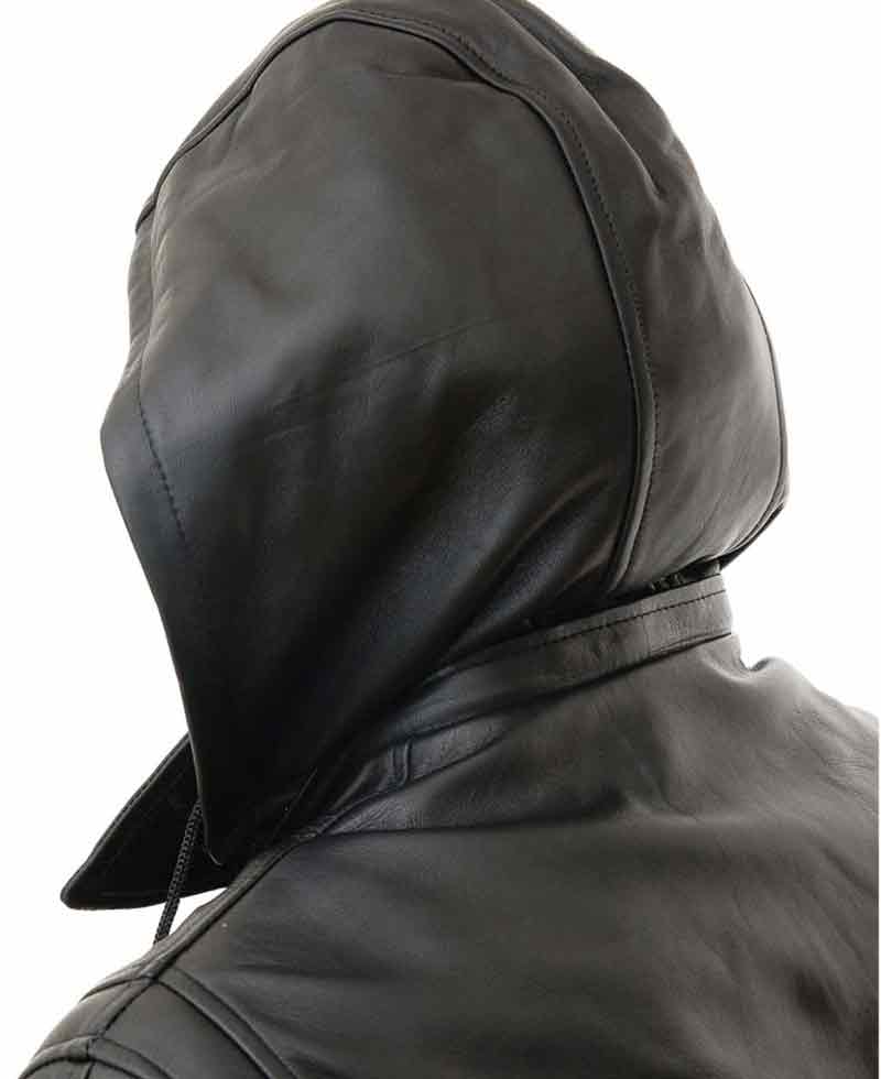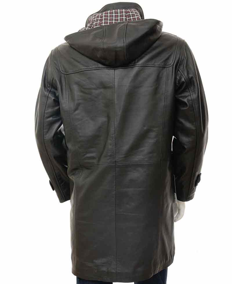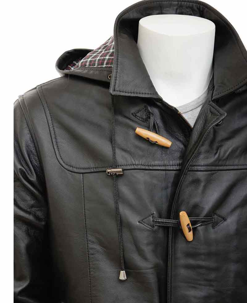 Men’s New Design Duffle Black Leather Coat with Removable Hoodi