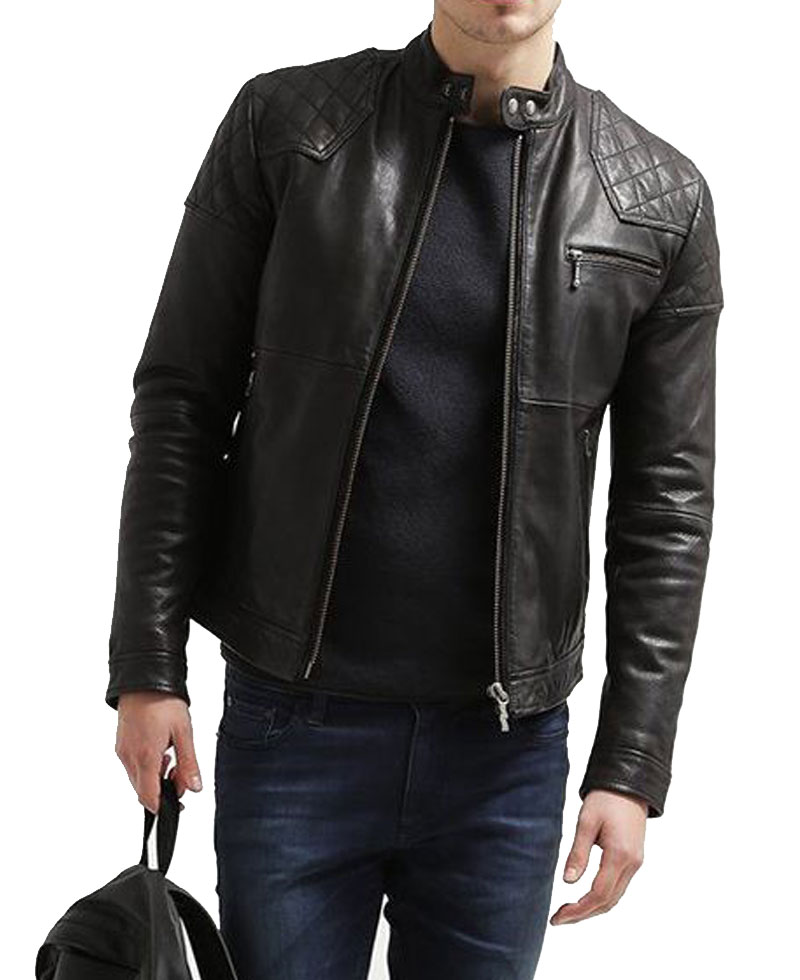 Men’s FJM105 Zipper Pockets Quilted Moto Black Leather Jacket