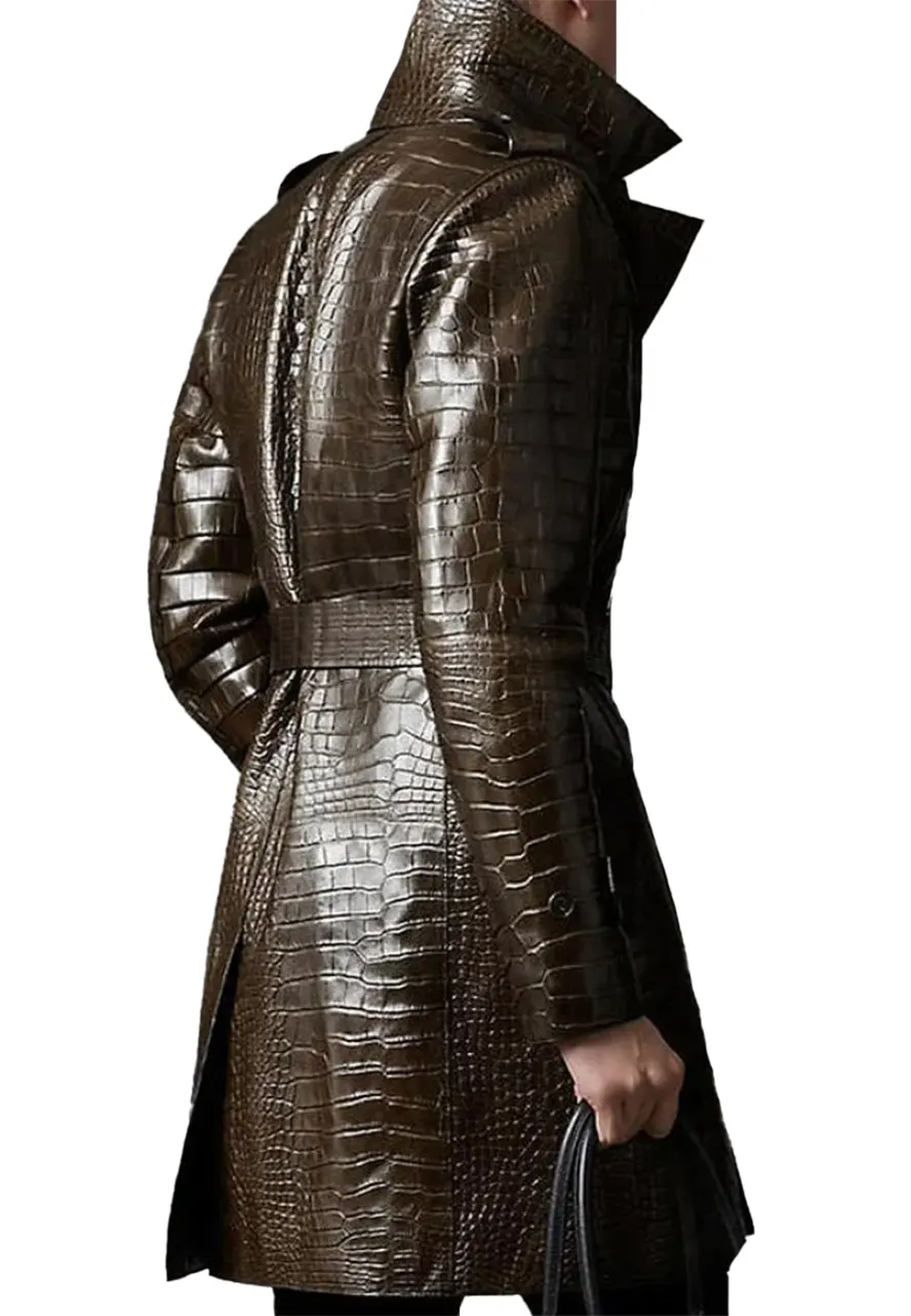 The stylish Gator coat has a very attractive appearance. The exterior of this stunning coat is manufactured with high-quality faux leather material. The fine quality stitching guarantees the durability of this apparel. The coat comes with an internal lining of smooth and soft viscose attached that keeps you warm and guards you against cold weather. The coat comes in an attractive brown color. The Gator coat has double breasted style buttons attached to its front side for the closure. The coat comes with a notch lapel-style collar. Alligator leather coat has strapped style cuffs on full length style sleeves. It also has shoulder epaulets. The Gator coat comes with two flap chest pockets and two flap waist pockets where you can secure stuff.