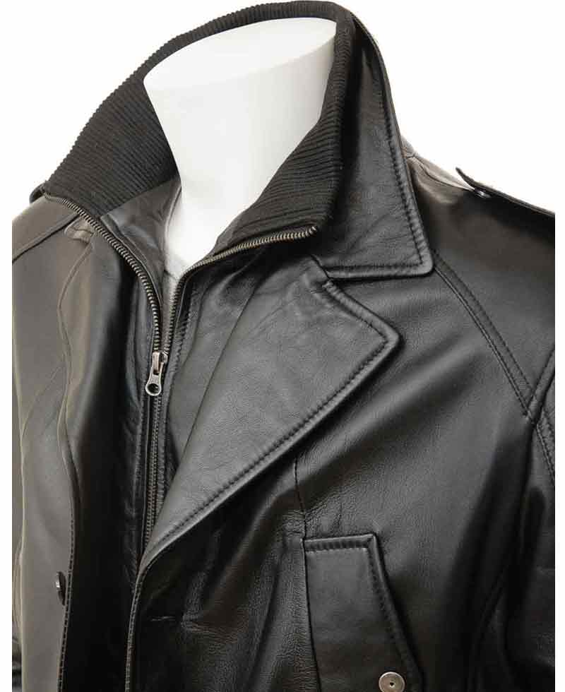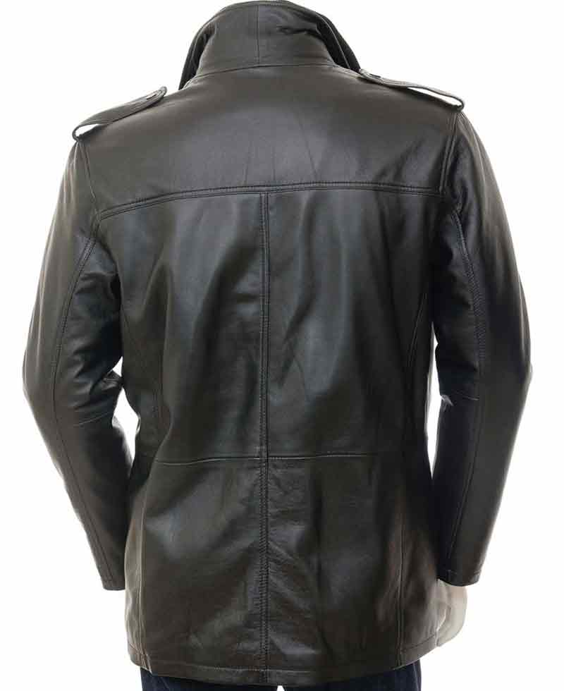Men’s Causal Wear Black Leather Peacoat with High Neck Collar