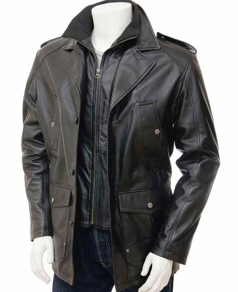 mens leather black peacoat is fabricated from high quality genuine leather material. This peacoat will keep you protected from cold weather and will make you feel warm and cozy. The inner side soft viscose lining makes this garb very comfortable to wear that you can wear it all day long. Selecting a perfect apparel to wear is a tough task therefore we bring you this leather peacoat which you can wear casually or for a party wear. mens high neck collar peacoat has open hem styled cuffs on full length sleeves. The ykk branded zippers are used in the manufacturing of this garb. The front zipper style closure along with buttons fits in perfectly with the style of this peacoat. This peacoat has flap waist pockets with 2 diagonal chest pockets. This peacoat has a notch style collar. You can get this apparel in a black color. There are shoulder epaulets as well on this garb.