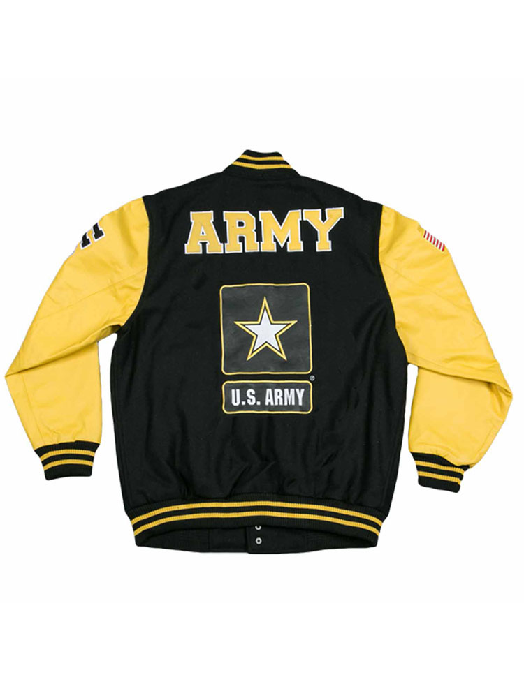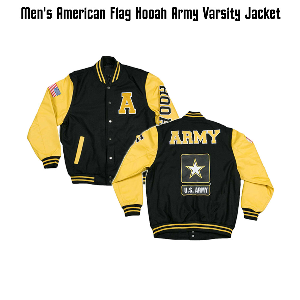 The Stylish Army Varsity Jacket Comes in a Mesmerizing Color Combination of Black and Yellow That Looks Attractive. The Exterior of This Varsity Jacket is Stitched With the Wool Fabric of Premium Quality. Top-quality Genuine Leather Material is Used for Making the Sleeves of This Army Hooah Jacket. The Internal Side of This Army Varsity Jacket is Stitched With Smooth and Soft Viscose Lining That Keeps You Warm and Comfy All the Time. The Hooah Varsity Jacket Has Long-length Style Sleeves With an American Flag Along With Rib-knitted Style Cuffs. There Are Buttons Attached to the Front Side of This Varsity Jacket for Closure. Hooah Varsity Jacket Has a Rib-knitted Waistband as Well. The Jacket Comes With an Erect Style Collar. It Has a Letter “a” Patch on the Chest. The Jacket Comes With Two Front Waist Pockets Where You Can Secure Stuff.