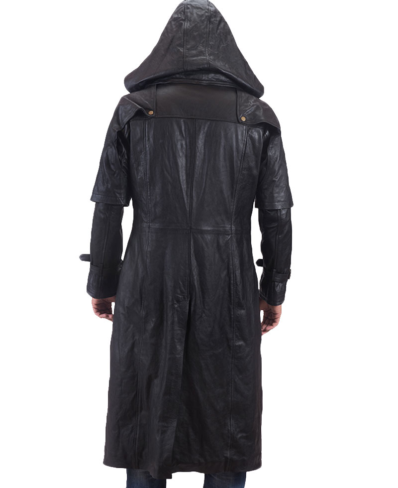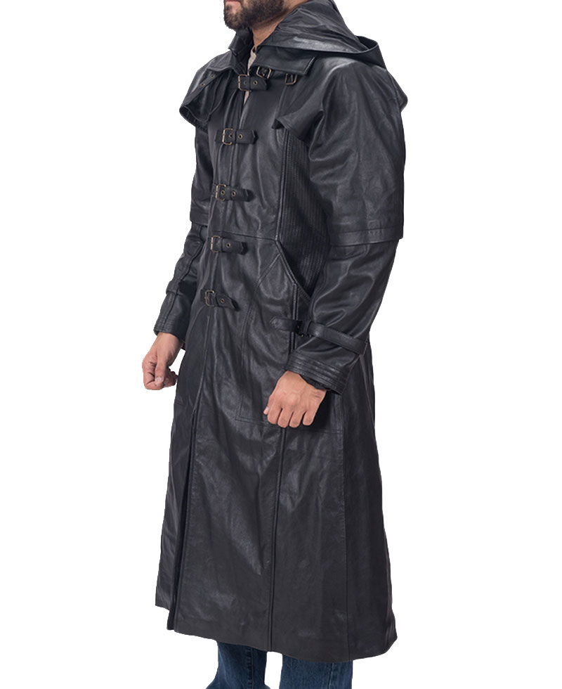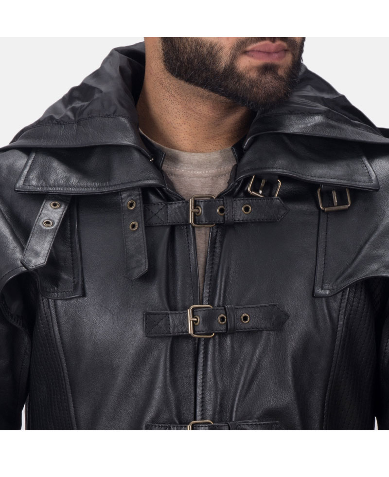 The leather trench coat with hood comes in black color. It is manufactured with a high and rich quality of genuine leather material that makes it enduring to wear. The leather trench coat has an internal lining of smooth and soft viscose that keeps you warm and comfortable the entire time. The leather trench coat with hood has buckles on its frontal for the closure. It has two front side waist pockets where you can keep stuff. The leather trench coat comes with an attached hoodie. It is perfect for men. The coat is long in length that makes it more attractive. The leather trench coat with hood has belted style cuffs on full length style fitted sleeves.