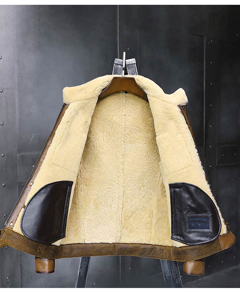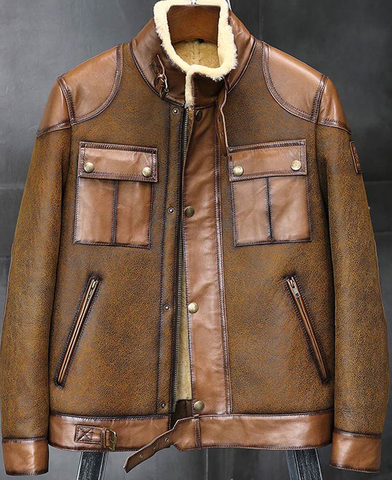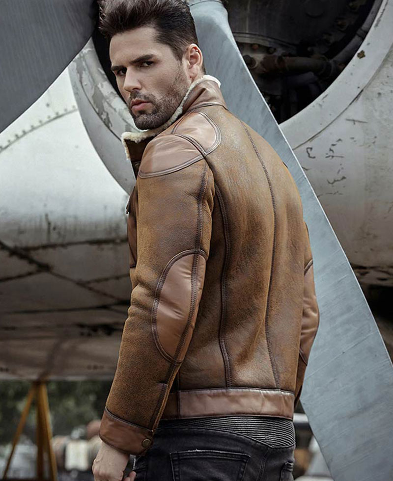 In winters we all look for trendy and warm apparel to suit personality. This Jason shearling jacket is the perfect pick for winters, especially for parties and outings. This jacket is manufactured from the high quality of sheepskin leather. The internal side of this leather jacket is stitched with soft and smooth faux shearling lining that will keep you warm and comfortable. The jacket comes in a mesmerizing and attractive brown color. B3 sheepskin jacket has a stand up style belted strapped collar that looks very classy. There are buttons on the cuffs along with full length style fitted sleeves. The two front side waist pockets and chest flapped pockets are designed for you to keep stuff. The jacket has a ykk branded zipper style closure along with snap tab style buttons that makes the front of this attire more captivating to wear.