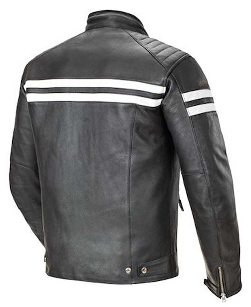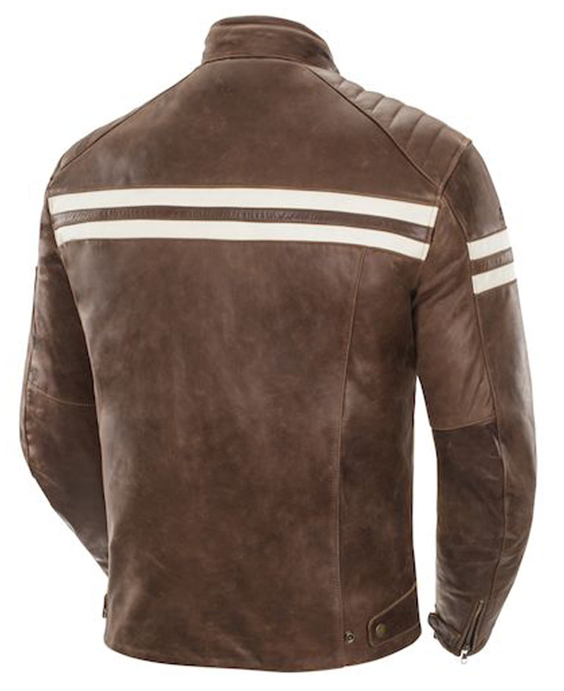 Men’s snap tab collar biker leather jacket is a pioneering fashion made from purely genuine leather available in black or brown color with viscose lining inside. The specialty of the attire is snap tab collar with YKK branded zip opening front. This unique jacket comprises four zip pockets. It has two horizontal pocket on chest and two vertical pockets on waist. The jacket has padded designing element on shoulder which makes it exclusive and safe moreover dual white shiny stripes designing on back of body and sleeves make men’s biker leather jacket more tempting.