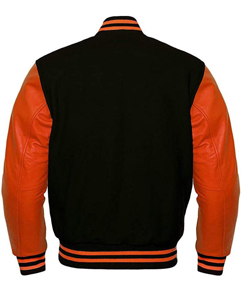 The classic and stylish orange varsity jacket comes with a combination of black color in it as well. The jacket is fabricated by using premium and rich quality wool fabric. The genuine leather material of top quality is used for the manufacturing of sleeves. On the internal side of this Orange varsity jacket is a lining of smooth and soft viscose that keeps you warm and comfortable all the time. The jacket has buttons attached to its front side for closure. Orange and black varsity jacket has rib-knitted style cuffs on long-length sleeves. The jacket has an erect style collar as well. There are two front waist pockets on this varsity jacket to secure stuff. The jacket also has a rib-knitted hemline that gives it a fitted look.
