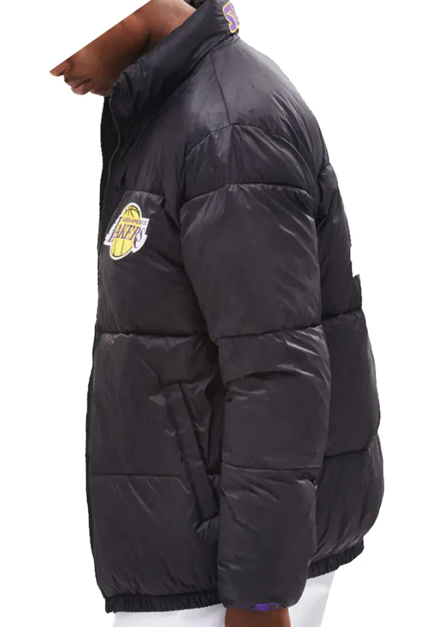 The attractive Lakers Puffer jacket comes in an appealing black color. The external side of this puffer jacket is fabricated with top-rich quality Nylon fabric. On the internal side of this Lakers Puffer jacket is a lining of smooth and soft viscose attached that keeps you warm and comfortable all the time. The puffer jacket has fine quality stitching that makes it durable to wear. On the front side of this puffer-style jacket is a ykk branded zipper attached for the closure. There is an elastic hemline on this starter Los Angeles lakers puffer jacket. The jacket has a stand-up style collar. There are two front waist pockets on this jacket as well where you can secure stuff. The starter Los Angeles lakers puffer jacket has Los Angeles Lakers logo on its chest as well. The jacket has elastic cuffs on full length style sleeves.