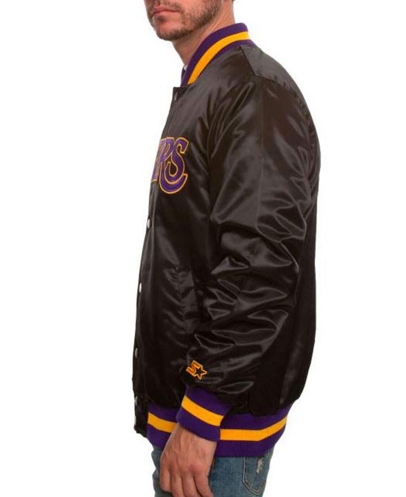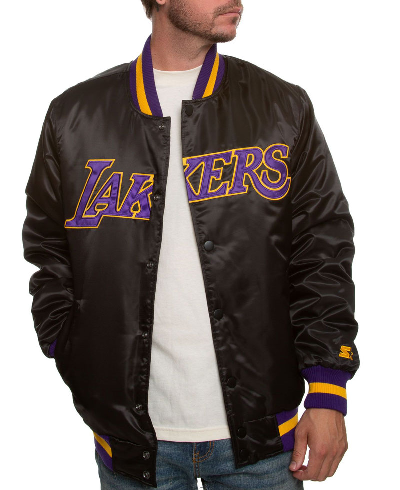 The stylish Lakers bomber jacket mens comes with an internal lining of smooth and soft viscose attached that makes this jacket comfortable enough to wear for a long time. The jacket guards you against cold weather. It is fabricated with premium quality of satin fabric. The black color of this bomber jacket makes it desirable to wear. There are buttons attached to the front side of this stylish Lakers bomber jacket mens for closure. The erect style collar looks awesome. Los Angeles Lakers bomber jacket have two front waist pockets where you can secure stuff. On the front side of this bomber jacket, Lakers is written in bold letters making the appearance of this apparel more attractive. The bomber jacket has rib knitted cuffs on full length style sleeves. Also, the jacket has a rib knitted hemline to give it a fitted look. This jacket is perfect for parties and outings.