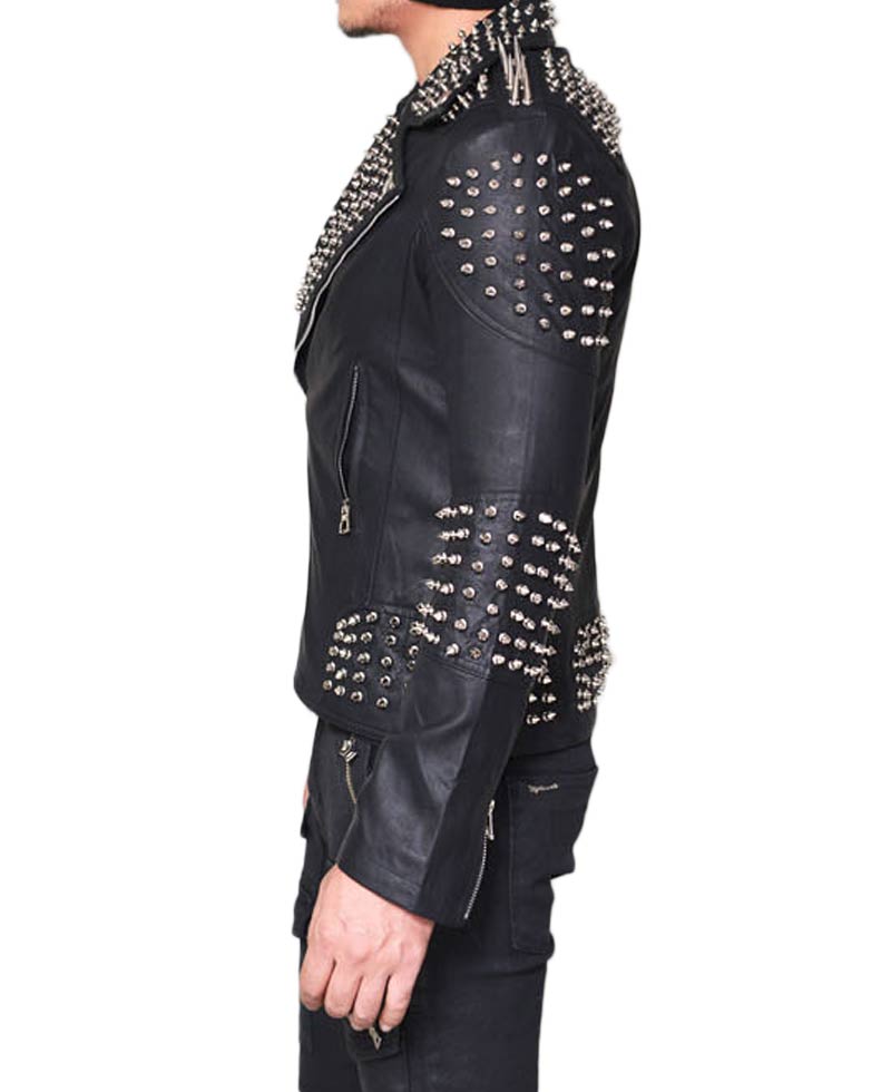 Men’s Asymmetrical Zipper Spiked Black Leather Motorcycle Jacket