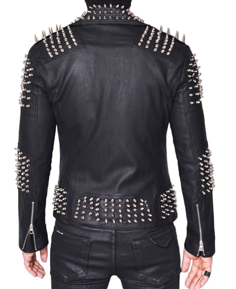 Now you chance fulfill your dress requirements by wearing spiked leather jacket. It has been prepared from 100% quality genuine leather with viscose linning inner for comfy and solace having bold black color. The front consists of lapel collar with zip terminating closure. Silver spike studs are place on collar, sleeves, shoulders and hemline makes black leather Moto jacket stylish and gives super stars look. There are two zipper pockets place on waist for your belongings. Lambskin black leather jacket has full sleeves with zippered cuff.