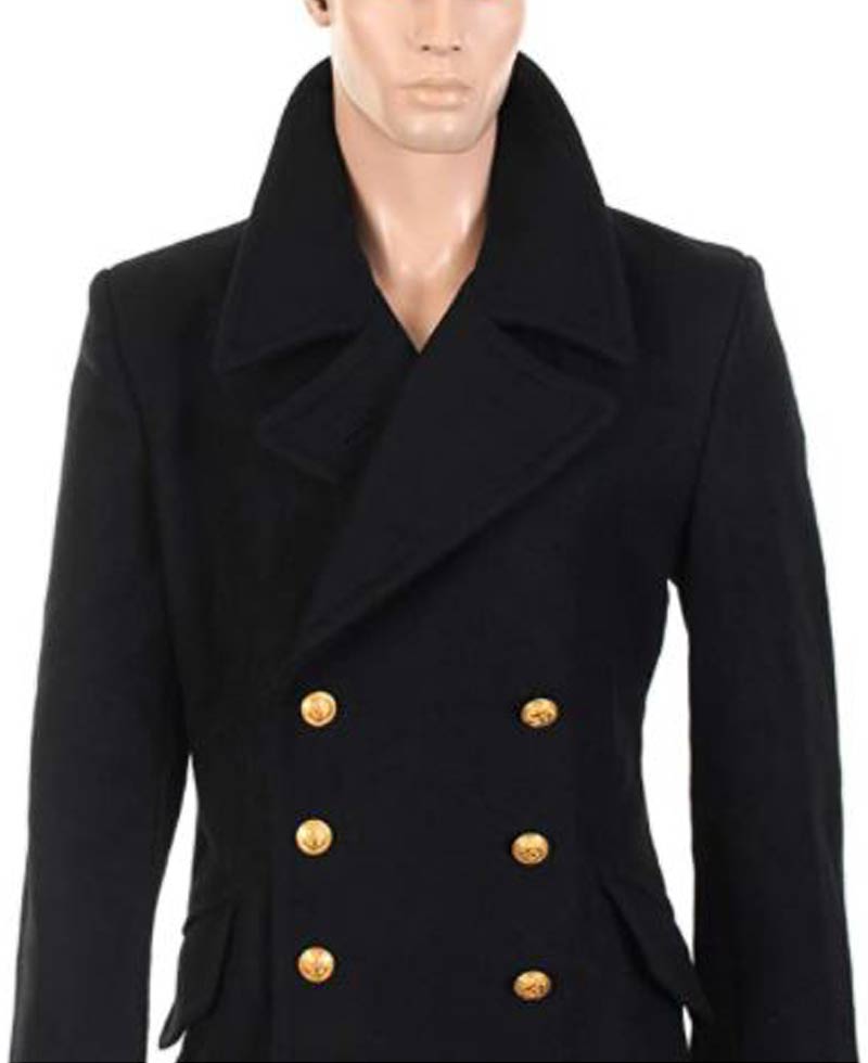 The very stylish and appealing greatcoat comes in black color. The external side of this apparel is fabricated with premium and rich quality the wool fabric. On the internal side of this apparel is a lining of smooth and soft viscose that keeps you comfortable and guards you against cold weather. Black Greatcoat has double-breasted style buttons attached to its front side for the closure. The coat has a notch lapel style collar. Naval Great coat has open hem style cuffs on full-length style sleeves. The two front waist pockets on this coat allow you to secure stuff. The coat has a long length. It is perfect winter apparel and it will give you a desirable look as well.