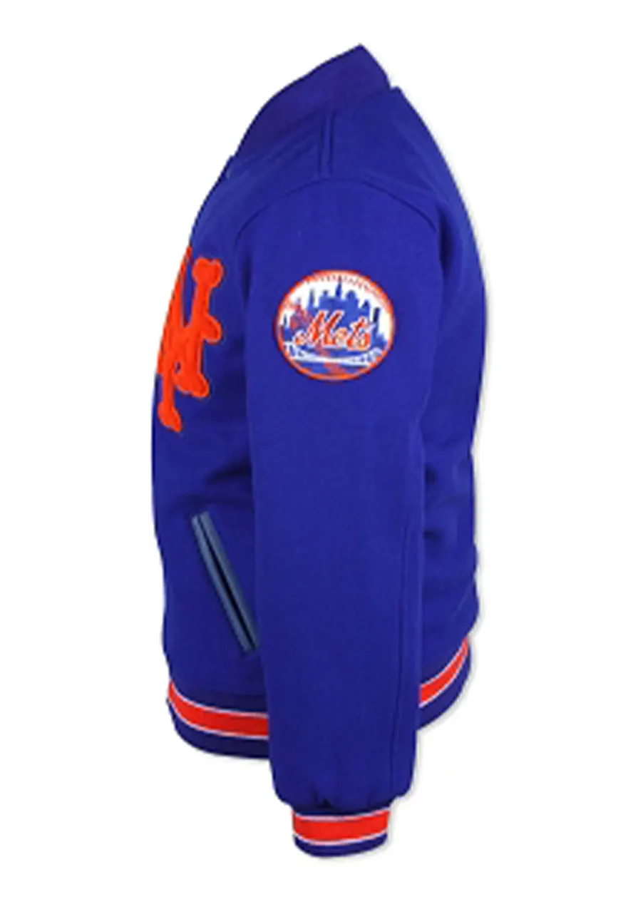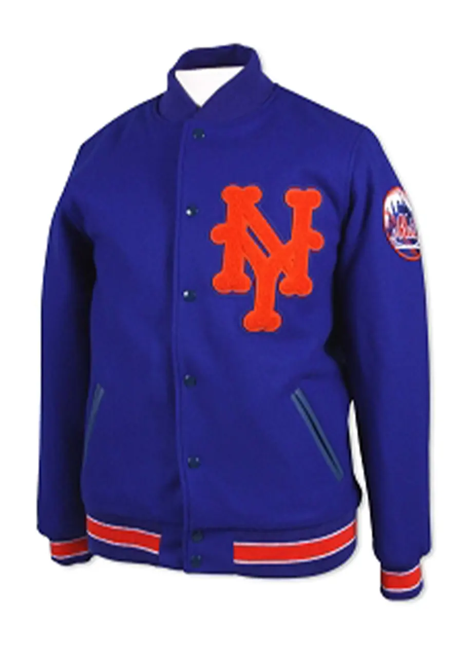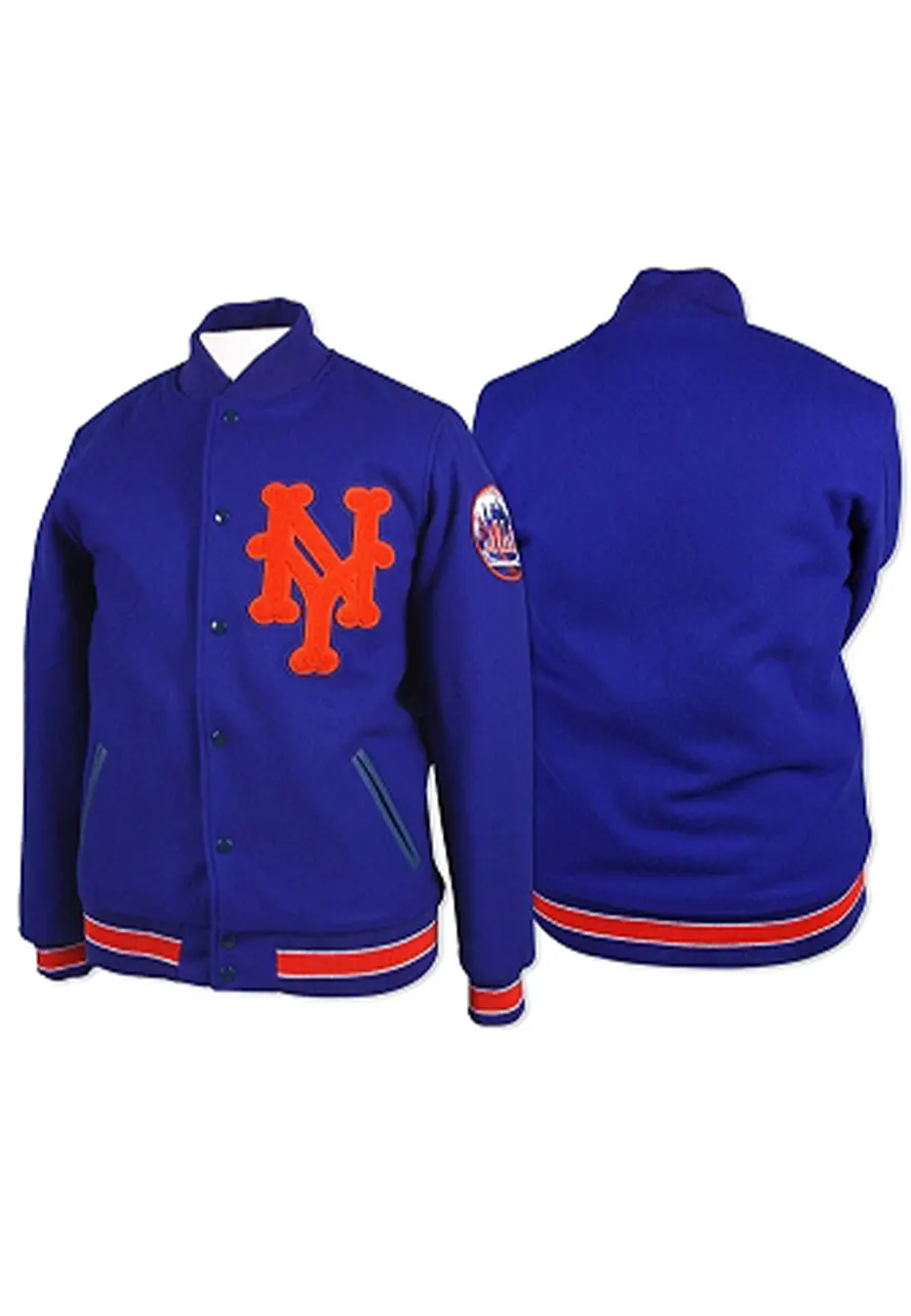 The stylish varsity jacket is fabricated by using rich and premium quality wool fabric. The internal side of this jacket is stitched with a smooth and soft viscose lining that guards you against cold weather and keeps you warm and comfy. The jacket comes in an appealing and attractive blue color. Mets Wool jacket has fine quality stitching that makes it durable to wear. There are buttons attached to the front side of this Mets Wool jacket for the closure. The jacket has a rib-knitted hemline that gives it a fitted look. Mets Ny Wool jacket has two front waist pockets where you can secure stuff. The jacket has rib-knitted style cuffs on full length style sleeves. There is a rib-knitted style collar on this Mets Wool jacket.Â