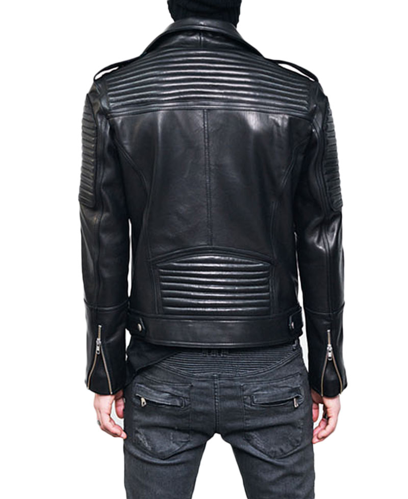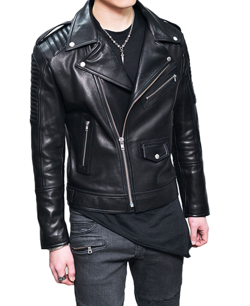 Men’s Padded Design Asymmetrical Zipper Biker Black Leather Jacket