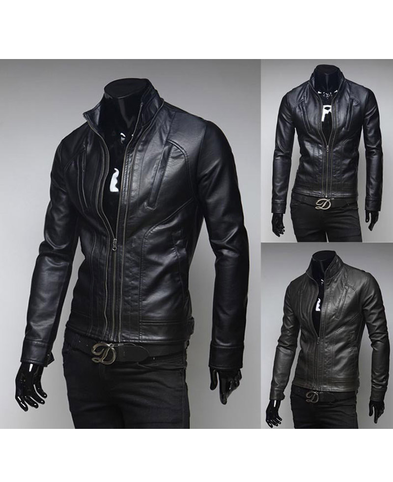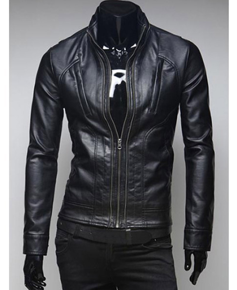 Men’s Pockets Design Stand Collar Slim Fit Black Faux Leather Jacket