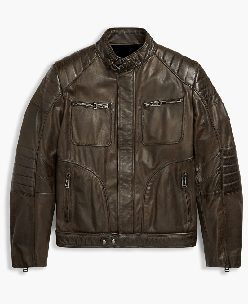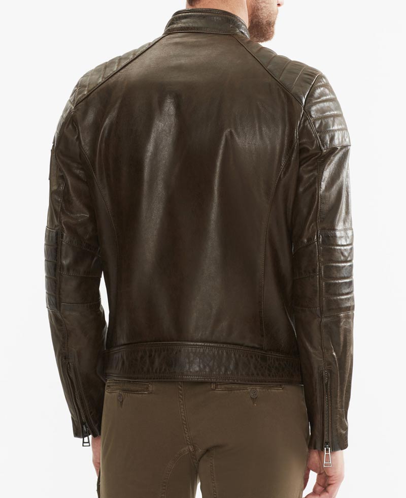 No better way to channel sophistication in winters at any event then pairing a quality leather jacket with any outfit. The extravagant Edwin jacket is available in genuine leather to get a more authentic experience. To add the sleek look front snap tab button closure and stand up collar with buckle fastening style collar is present on quilted moto jacket brown leather jacket. Two horizontal and two vertical zipper pockets are present on both side of lower waist line and chest vice versa. Brown waxed leather jacket has a trendy look with full hem line sleeves with zipper cuffs and padded detailing at the shoulder blades along with elbow line for providing it an appealing look. The quilted moto jacket is internally lined with viscose fabric for added softness.