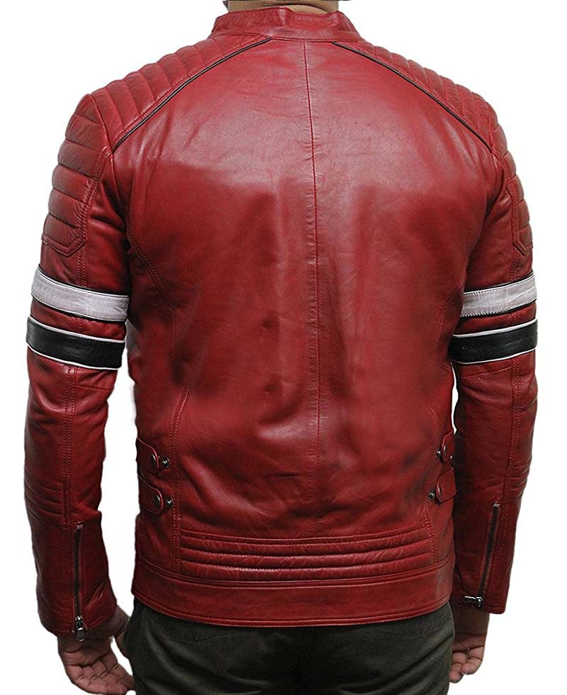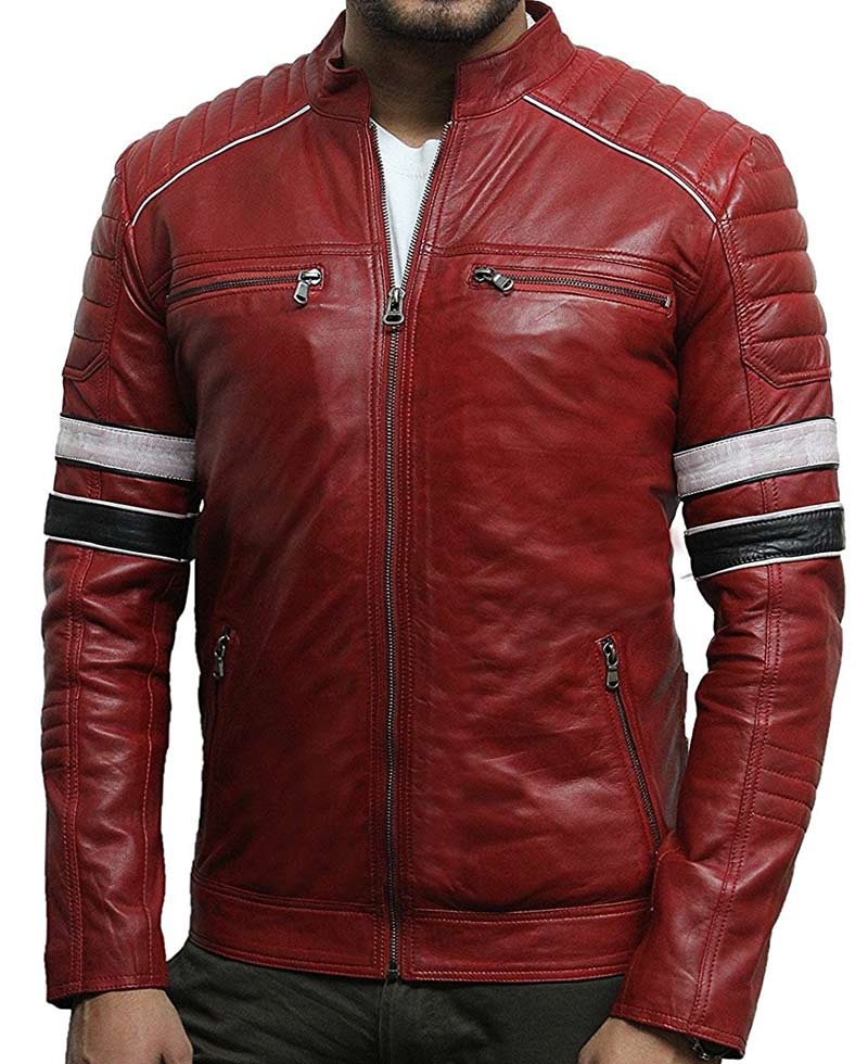The struggle for men to look the best and attract the crowd has been real for past years but now they have been gravitating towards leather jackets that helps them to stand out and look apart. Biker red leather jacket is available in genuine leather and faux leather to provide options to the wearer. A classic front zipper closure and stand up collar is present on red leather biker jacket to enhance the rough tough vibe of the jacket. Biker red leather jacket has zipper pocket on both sides of chest and also on both sides of waist. The high points of red leather biker jacket is the black and white stripe detailing on arms, padded elbow area of zipper cuffed full length sleeves, padded shoulders, double buckle adjustment and padded detailing above the hemline of back. The red leather biker jacket is internally lined with viscose fabric.