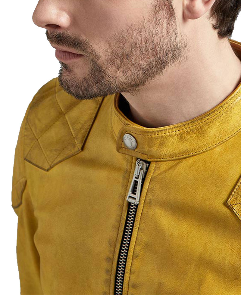 This mesmerizing and stylish stunning leather jacket is the men’s number one choice. This jacket is manufactured from high quality genuine leather material. It comes with internal soft and comfortable viscose lining that keeps you warm and comfortable all the time. The apparel has an internal soft and comfortable viscose lining attached that keeps you warm and comfortable. The men’s cafe racer yellow leather jacket has two front side waist pockets. It comes with a snap tab style collar. The leather jacket comes in yellow color. The cafe racer yellow jacket has padded shoulders. It comes with zipper cuffs on full length style sleeves. The front ykk branded zipper closure fits in perfectly with the style of this jacket. This jacket is perfect for late-night outings and casual parties.