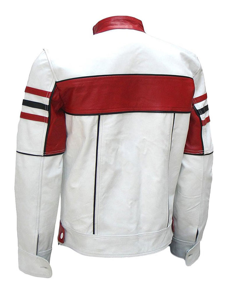 The white leather biker jacket is a perfect blend for the style and peculiarity for the men who have an interest for maintaining the personal protection and style humor in one package i.e. the slim fit white jacket. The men’s biker striped designed slim fit white leather jacket is available in both genuine and faux leather with exclusive and rare stand up collar with button and zipper closure which provides a classics for the bikers. The imploring design of slim fit white jacket red and black stripes on shoulders, red and black stripes on open cuffed full length sleeves with a red leather section on chest fetch the attention of you while searching a perfect blend of style and decency combination. In addition, Zipper pockets on waist and two inside pocket add it more durable and worthy for the choice to be made.
