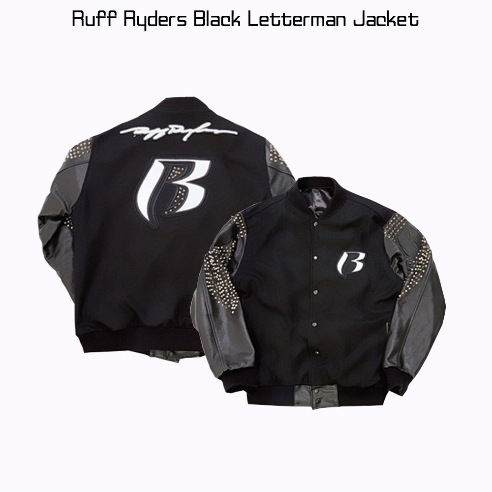The Stylish Ruff Ryders Jacket Comes in an Attractive Black Color. The External Side of This Letterman Jacket is Fabricated by Using High Quality Wool Fabric. Top Quality Genuine Leather Material is Used as Well for the Manufacturing of the Sleeves. The Ruff Ryders Jacket Comes With an Internal Lining of Smooth and Soft Viscose That Guards You Against Cold Weather and Keeps You Warm and Comfortable. The Letterman Jacket Has Fine Quality Stitching That Makes It Durable to Wear. Ruff Ryders Varsity Jacket Has Rib Knitted Style Cuffs on Full Length Style Sleeves. The Letterman Varsity Jacket Has Buttons Attached to Its Front Side for Closure. The Jacket Has an Rib-knitted Collar Too. The Ruff Ryders Varsity Jacket Has Two Front Waist Pockets Where You Can Secure Stuff. The Rib Knitted Hemline Gives This Jacket a Fitted Look.