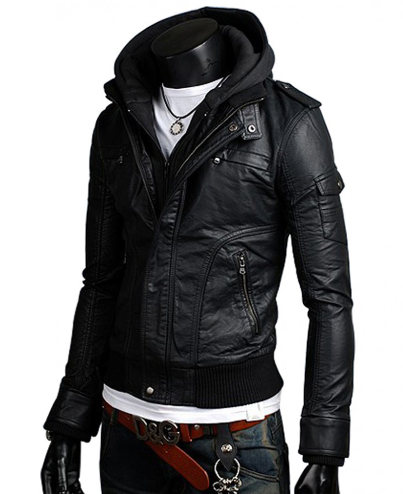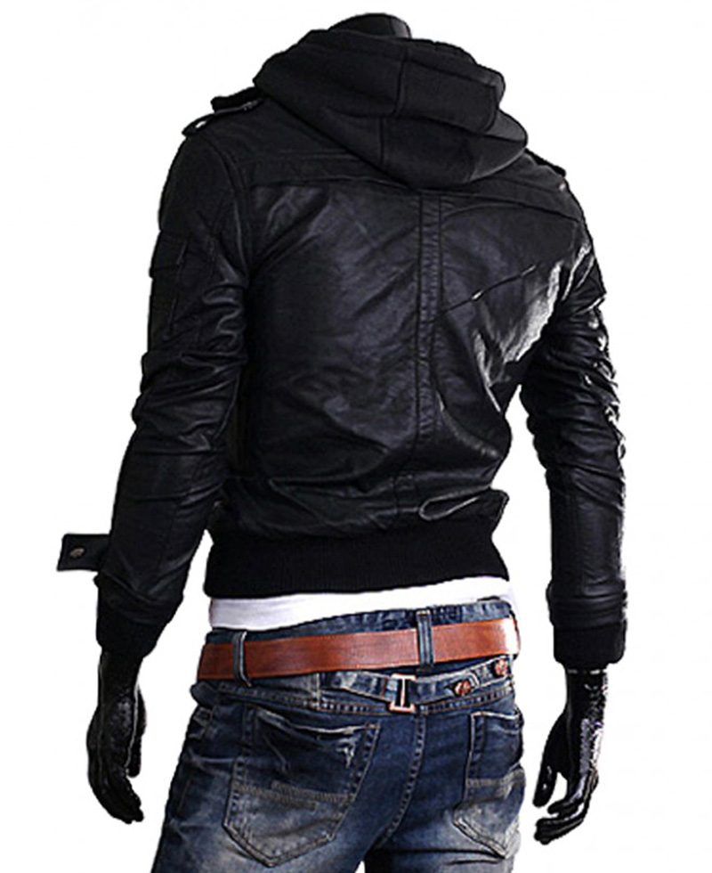 Men’s Slim Fit Black Leather Jacket With Hoodie