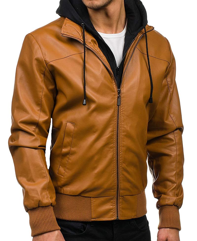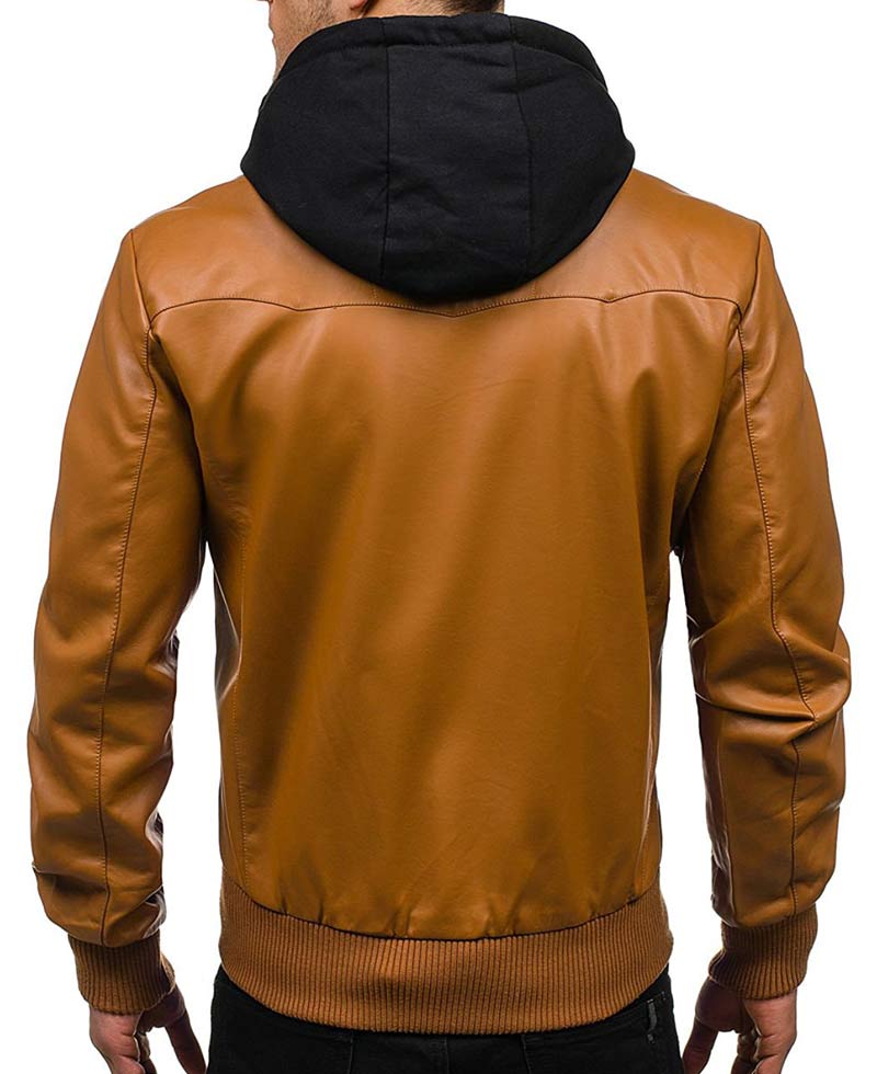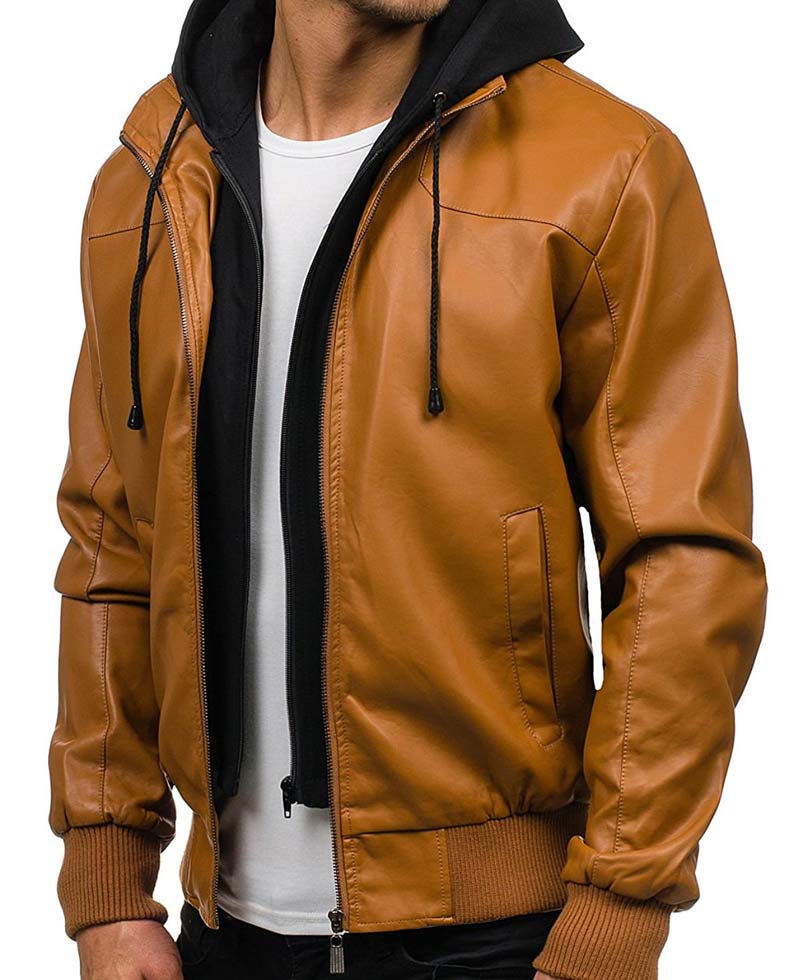 Men’s Slim Fit Camel Brown Leather Jacket with Hoodie