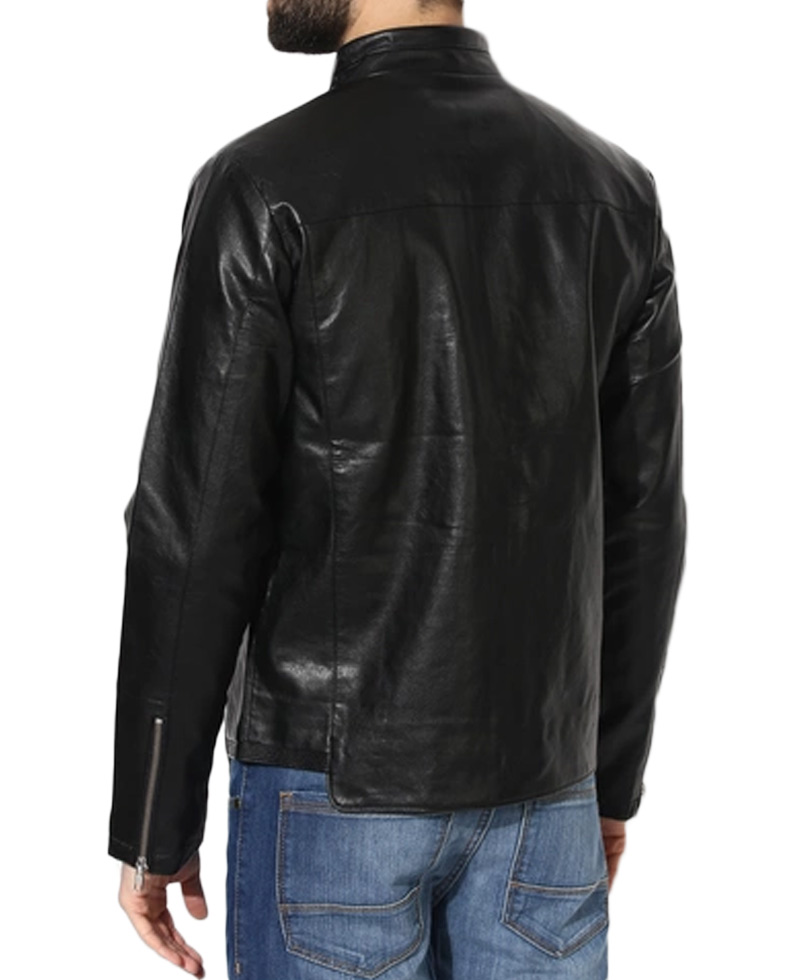 This dress has been prepared from high quality genuine leather and also has faux material for clients. Simple black jacket has viscose lining inner for your comfy and ease having eye-catching black color his jacket play vital role in making your persona outstanding. The stand up collar is given in it. It has front zip closing. It has all features perfect and simple gives you astonish look. Stand collar jacket has full sleeves along zippered cuffs make your personality appealing. Neat and fined stitching because it has been prepared under the professional staff.