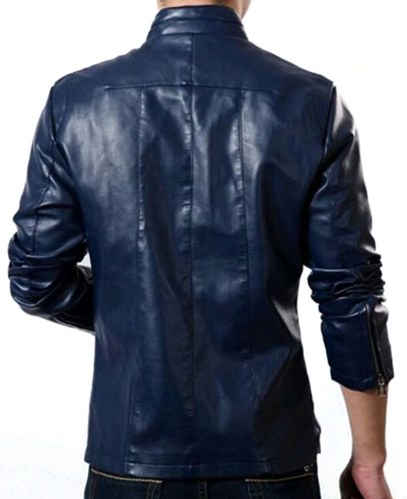 Men’s Stand Collar Slim Fit Blue Faux Leather Jacket