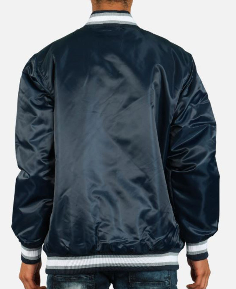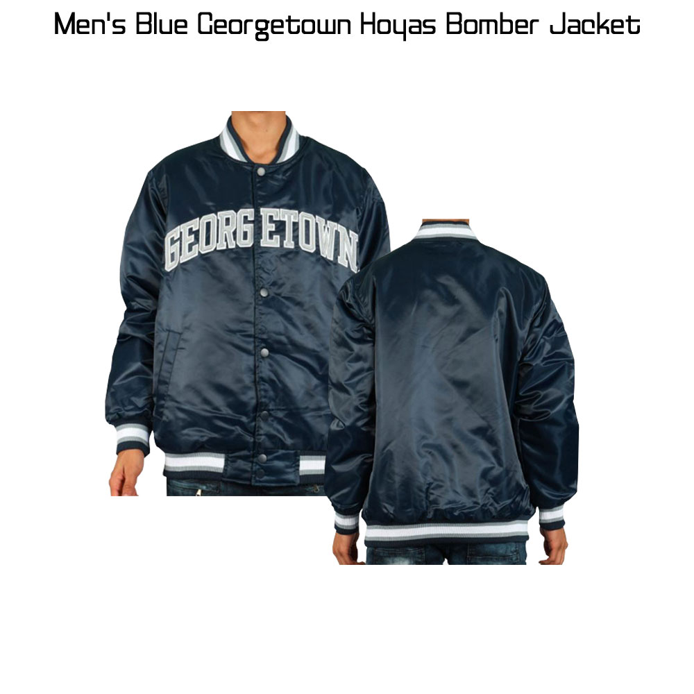 The stylish Georgetown hoyas bomber jacket comes in a mesmerizing and attractive blue color. The external side of this bomber jacket is fabricated with satin material of top quality. The inner side of this Georgetown hoyas bomber jacket is stitched with smooth and soft viscose lining that keeps you warm and comfortable all the time. The bomber jacket has fine quality stitching. The Georgetown hoyas bomber jacket has a rib knitted style collar. On the front side of this bomber jacket are buttons attached for the closure. The Georgetown satin jacket has two front waist pockets where you can secure stuff. The jacket has a rib knitted hemline as well. It comes with rib-knitted style cuffs on full-length style sleeves. There is a Georgetown logo on the front side of this bomber jacket.